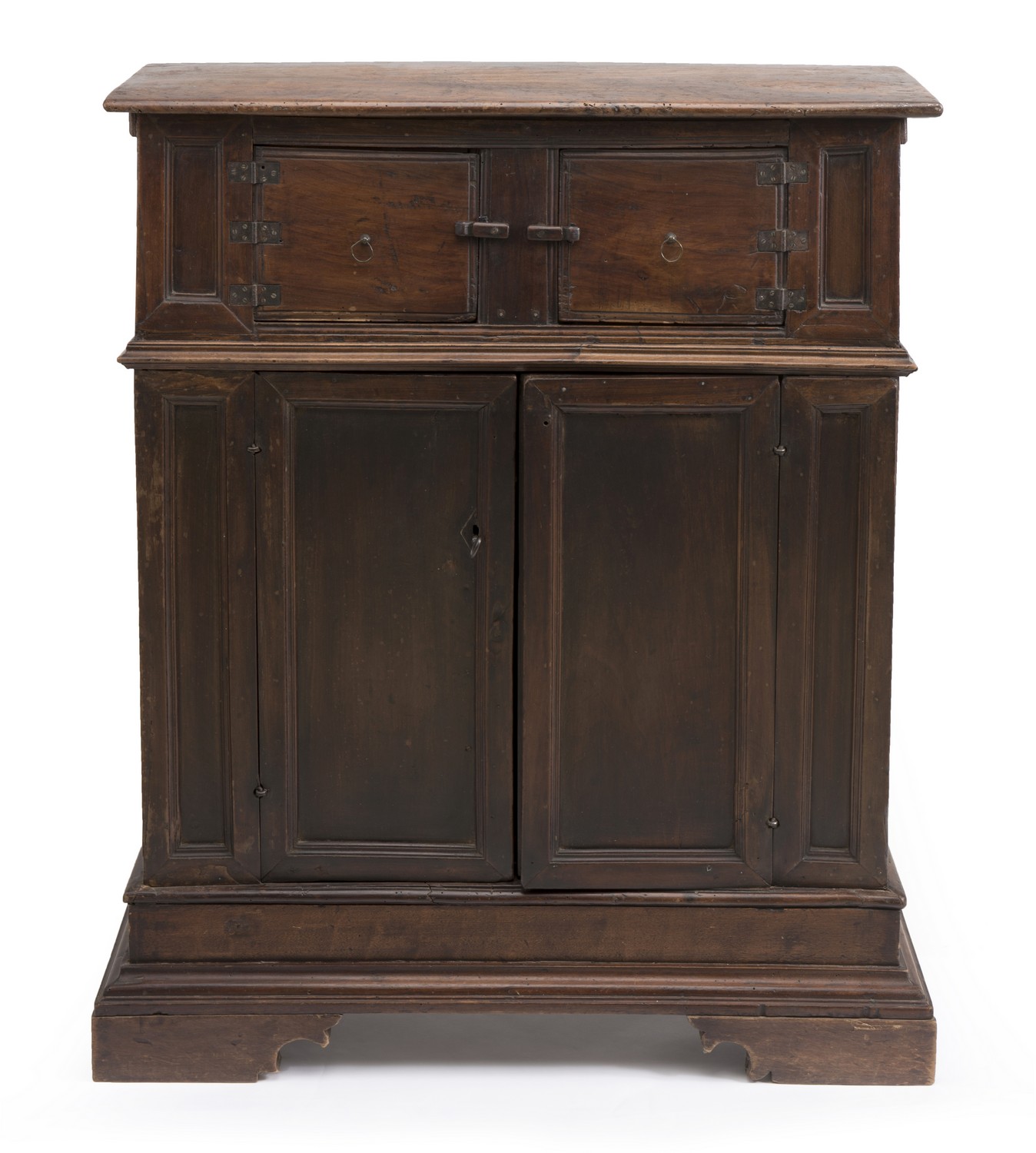 The provinical credenza with a lovely patina. Two doors to upper body revealing a small single shelf, the lower body with two larger doors enclosing a larger storage cavity with two shelves.