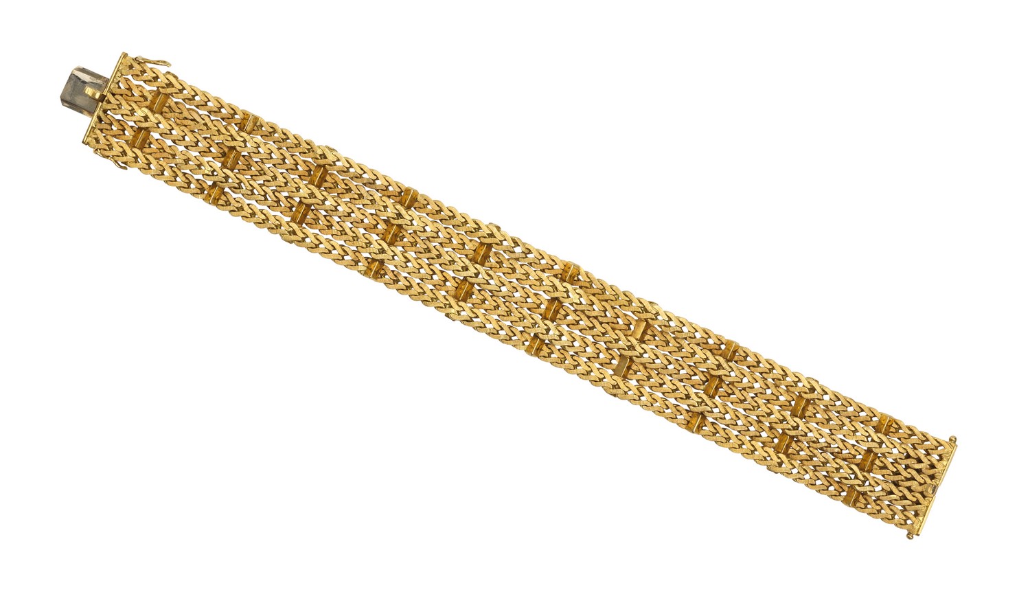 Comprising five rows of woven style links, with textured detail, in 18ct gold, total length 185mm.