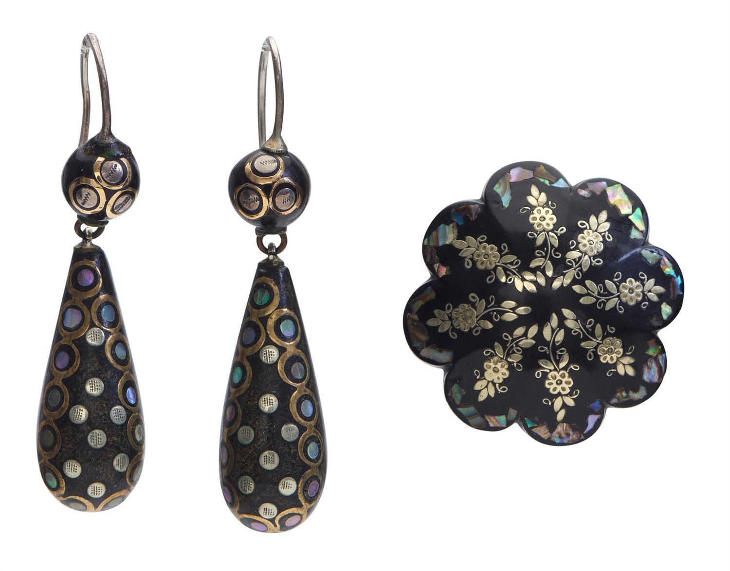 Comprising a stylised floral brooch and a pair of drop earrings, each inlaid with gold and paua shell, to 18ct gold and silver fittings respectively.