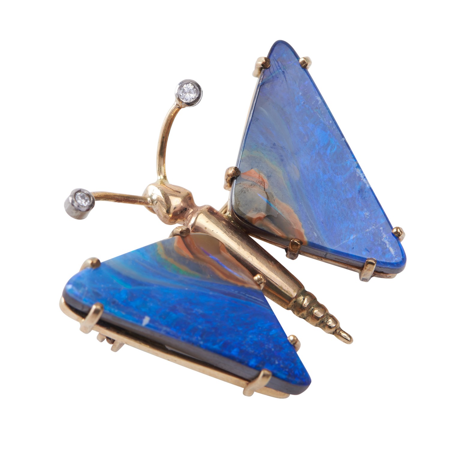 Comprisng wings set with boulder opal and antennae set with round brilliant cut diamonds, in 9ct gold.