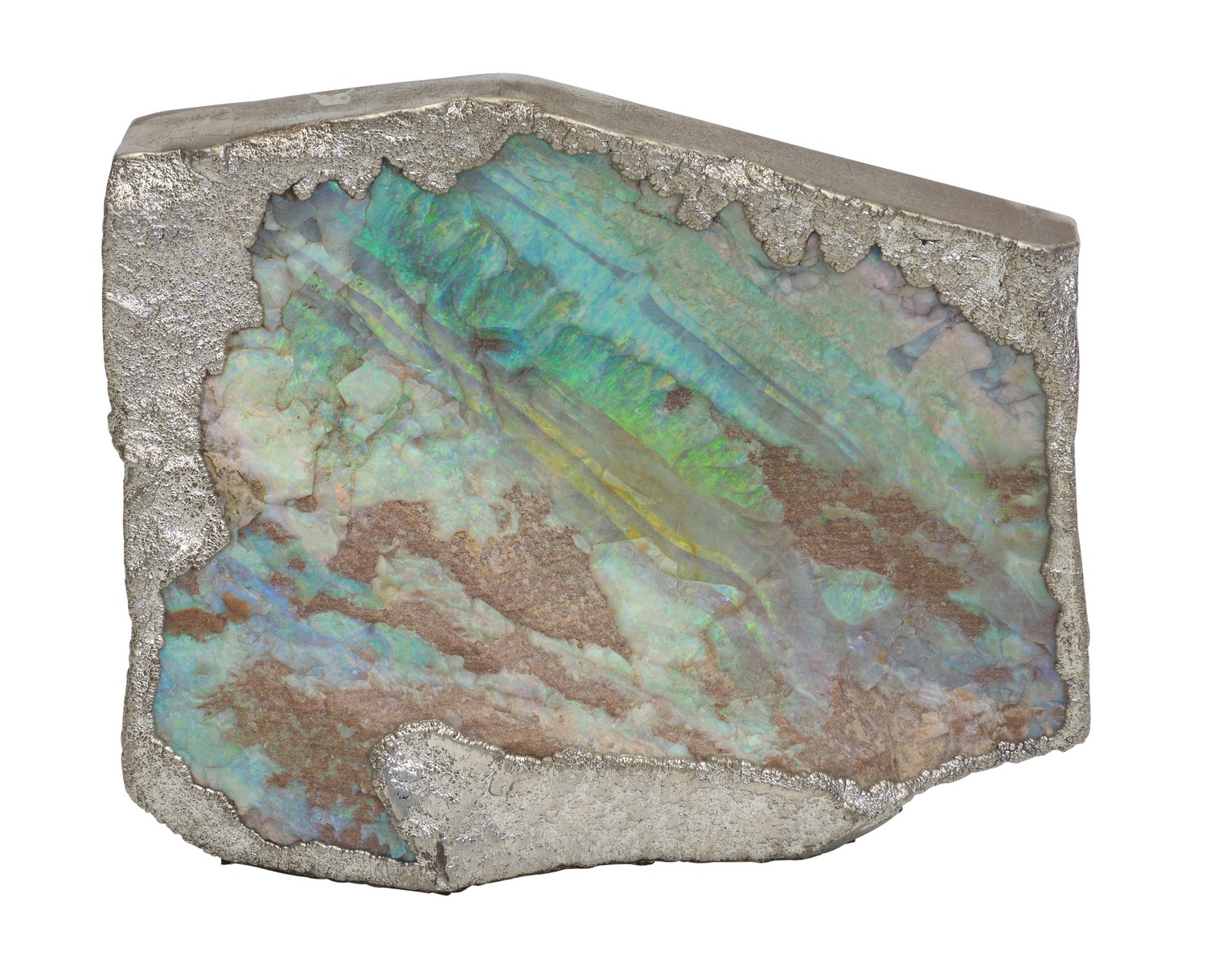 The freeform opal specimen, framed in silver.