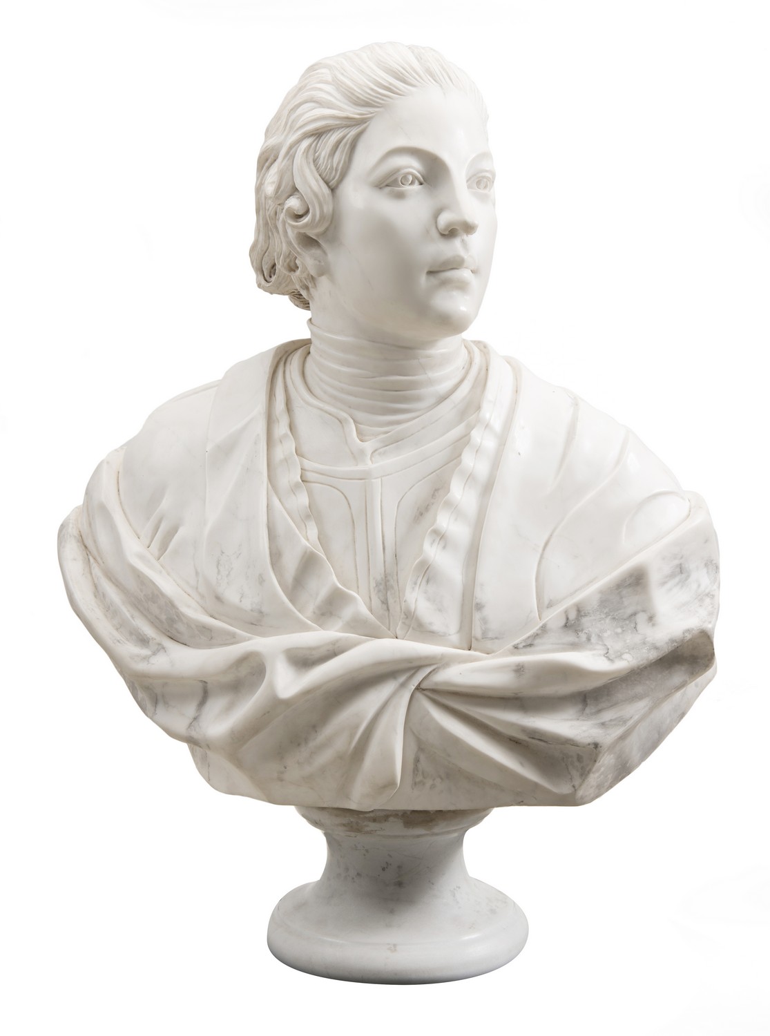 Modelled in the classical style with draped robes, raised on a circular socle.
