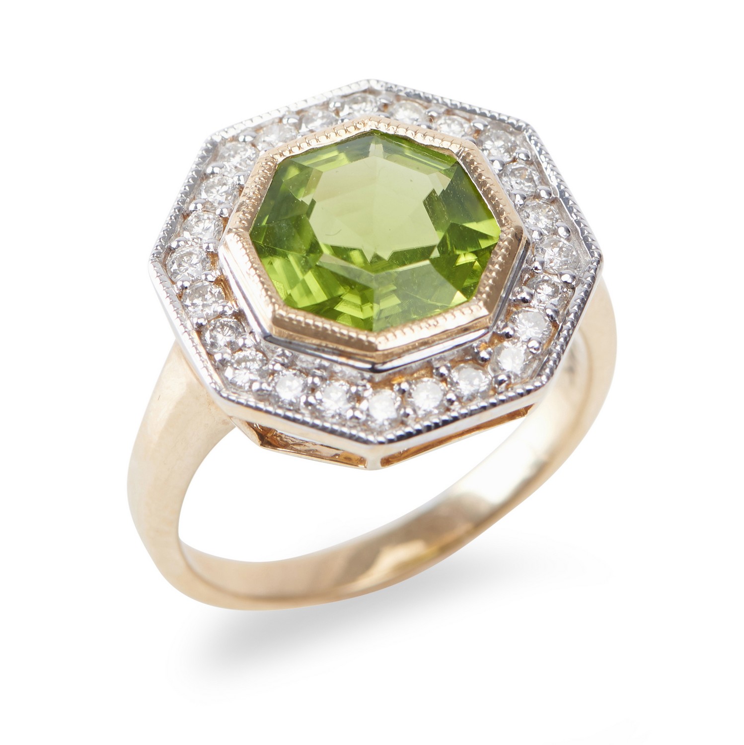 Of Art Deco style, featuring an octagonal peridot weighing an estimated 4.43cts, in a surround of round brilliant cut diamonds totalling 0.44cts, in 14ct gold, ring size M.