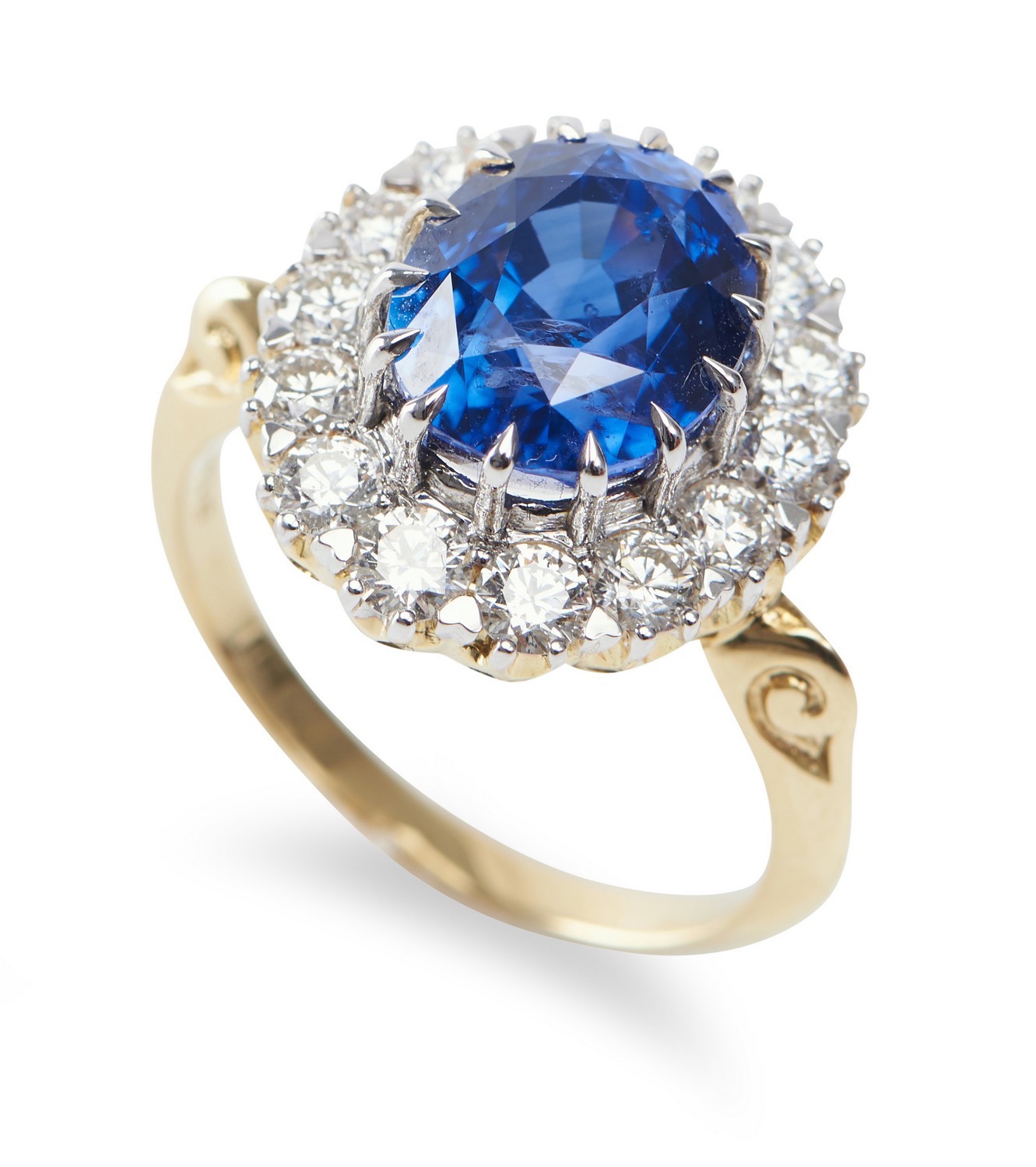 Of cluster design, featuring an oval blue sapphire weighing an estimated 7.12cts, surrounded by round brilliant cut diamonds totalling 1.30cts, in 18ct gold, ring size P.
