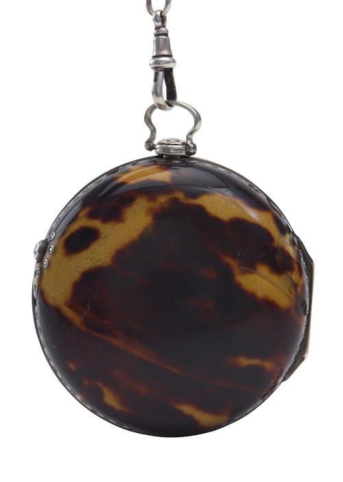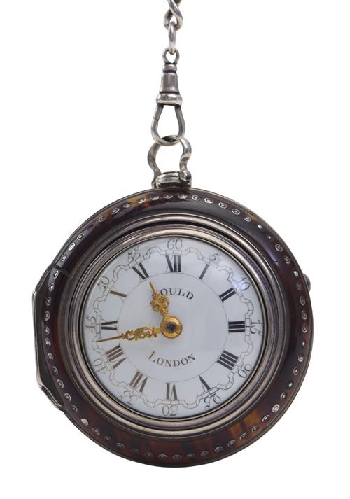 English, made for the Dutch Market, key wind, circular white dial with black Roman numerals and chapter ring, movement signed Gould, London, sterling silver case, and embossed central case, with tortoise shell and silver fitted outer case, dial diameter 41mm, together with a graduating fob chain with T-bar fitting and three medallions, in sterling silver.