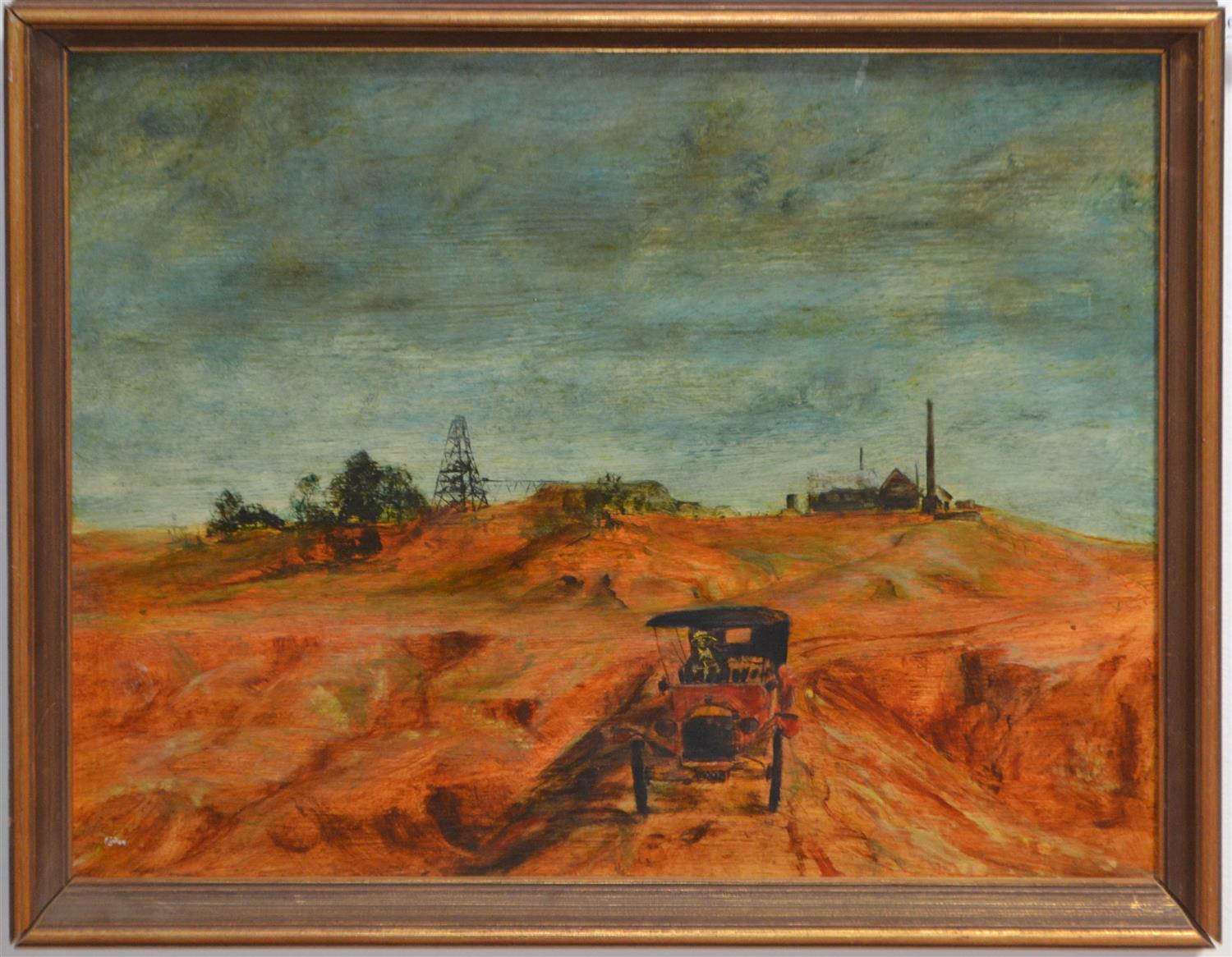 CLYDE CLINTON, OUTBACK LANDSCAPE, OIL ON BOARD, IMAGE SIZE: 52 X 63CM, FRAME SIZE: 59 X 70CM, CONDITION: SURFACE MARKS LOWER RIGHT, WEAR TO FRAME