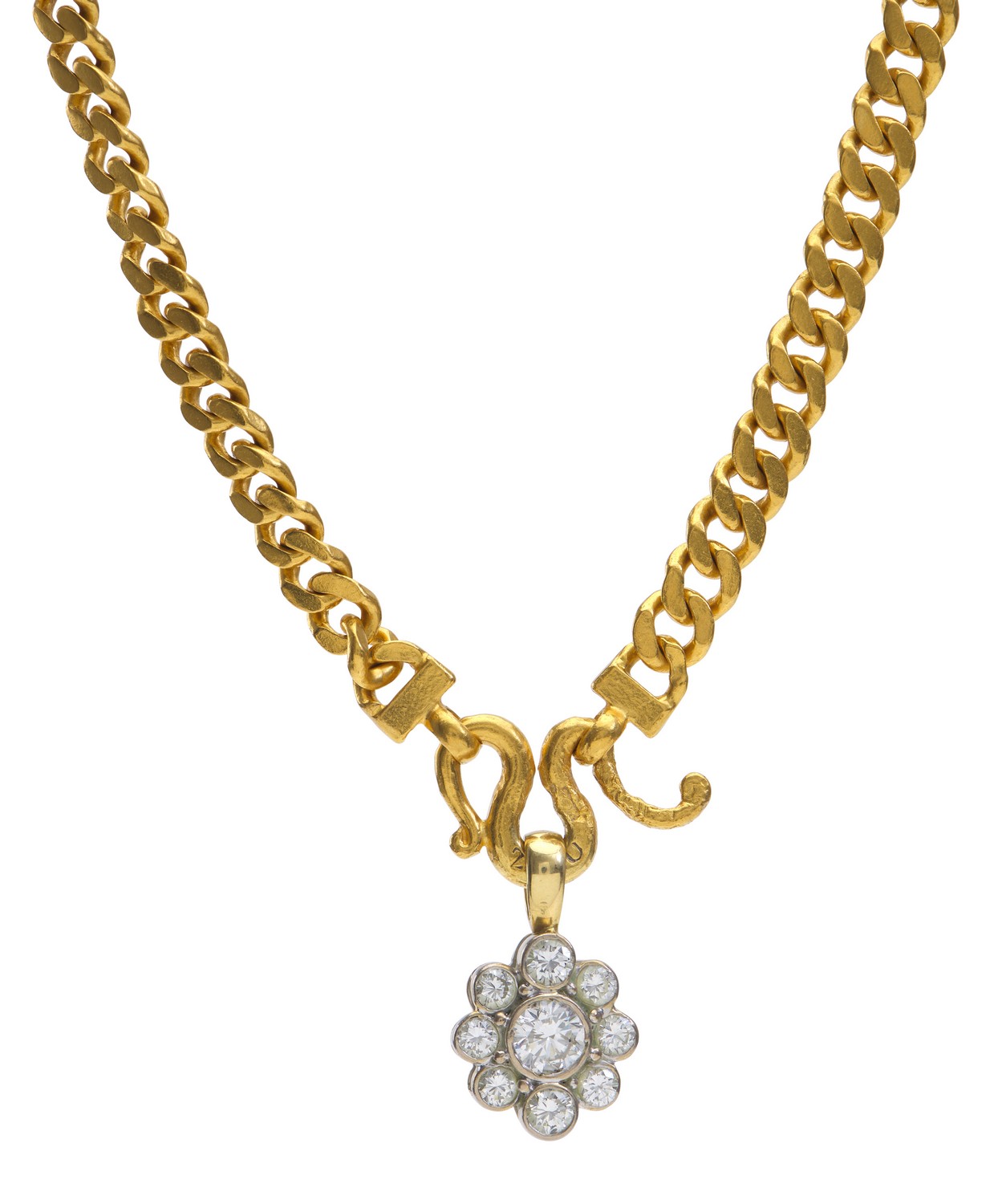 Comprising a floral style cluster of round brilliant cut diamonds, altogether totalling an estimated 2.80cts, suspended on a curb link chain in 24ct gold, total length 465mm.