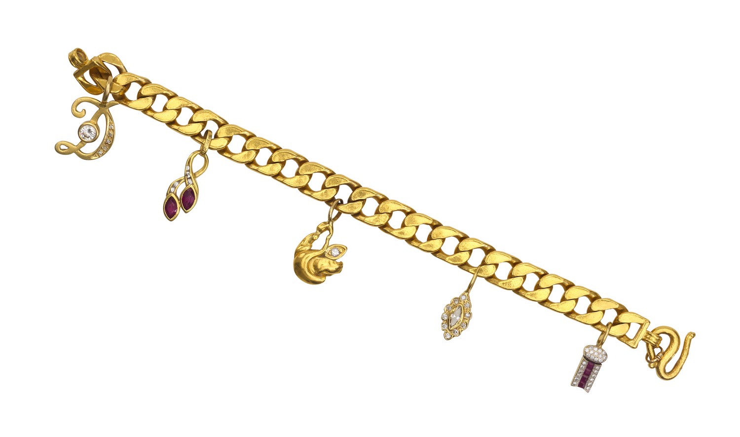 The curblink bracelet set with five assorted charms in 18ct gold detailed with diamonds and rubies, suspended from a curb link bracelet in 23ct gold, total length 175mm.