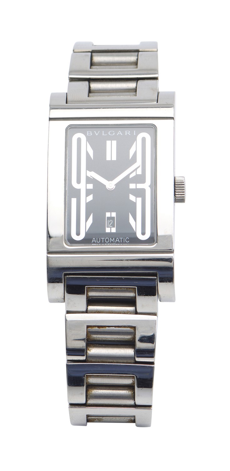 Automatic movement, rectangular black dial with silver numerals, date aperture at six, signed case, dial and movement, to stainless steel case and conforming bracelet bands, case reference RT 45S / J18965, case length 42mm x 26mm, boxed with papers.