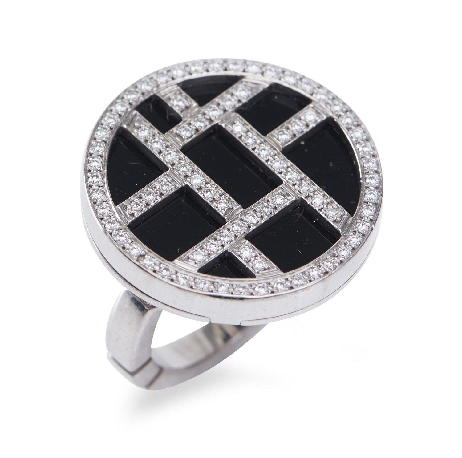 From the 'Metropolis Woven' series, the circular onyx plaque with a geometrical overlay set with round brilliant cut diamonds, signed, in 18ct white gold, ring size N.