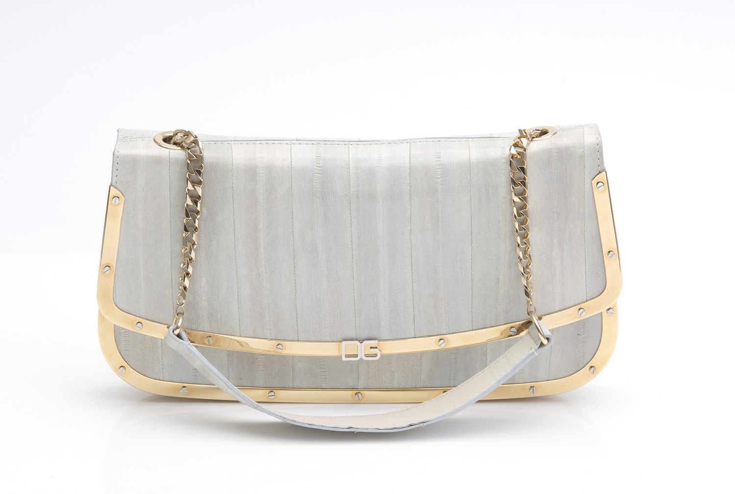 Styled in grey eel skin leather with two tone metal hardware and chain link strap, 15 x 29 x 3cm.