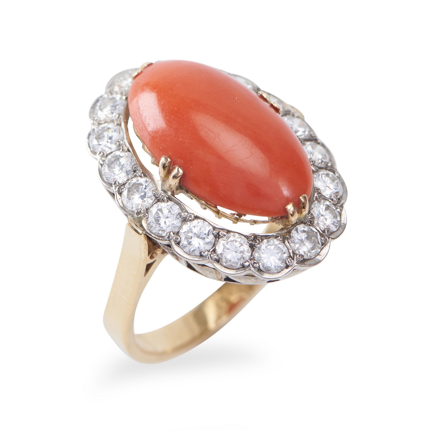 Of cluster design, featuring an oval coral cut en cabochon, surrounded by eighteen round brilliant cut diamonds, in 18ct gold, ring size Q.