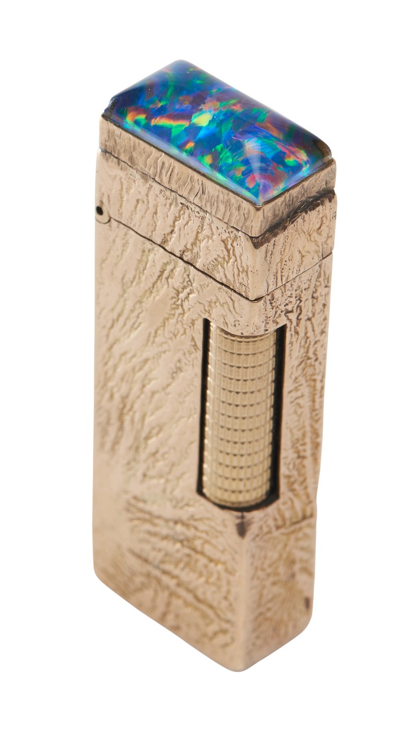 The rectangular lighter with textured finish and Olympic Fields opal set lid, in 9ct gold.