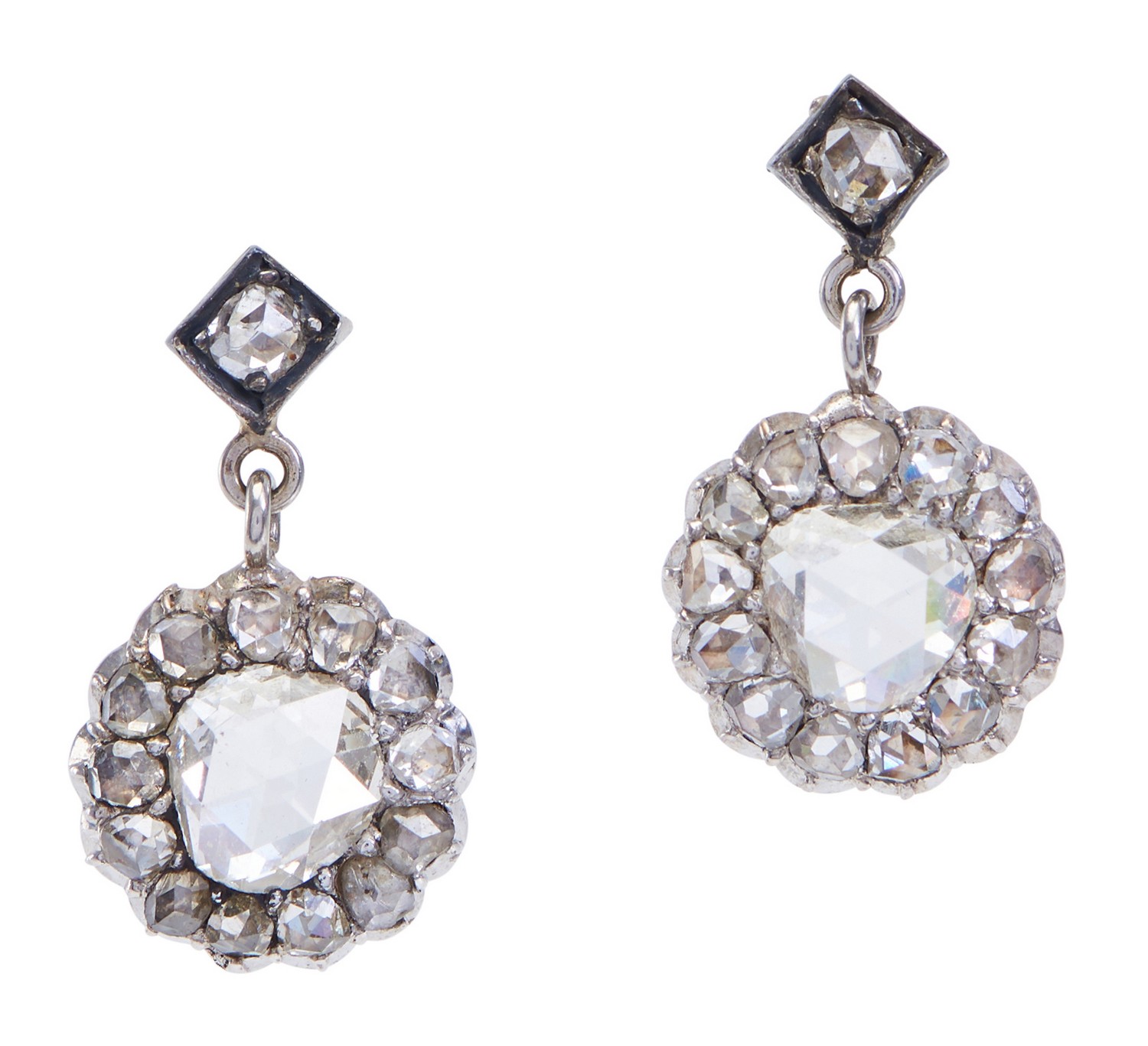 Each drop centrally set with a rose cut diamond weighing an estimated 0.40cts, in a surround of smaller rose cut diamonds, in 18ct white gold, the top surmount and pin in sterling silver.