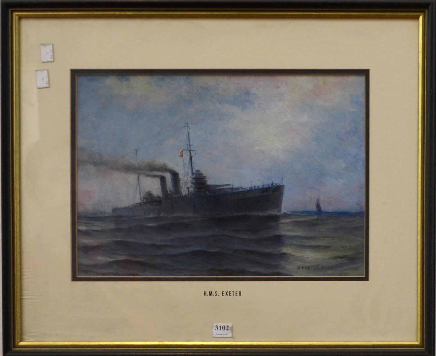 HAROLD DALTON HALL, H.M.S EXETER, OIL ON CANVAS, IMAGE SIZE: 26 X 37CM, MINOR SURFACE SPOTS BUT OTHERWISE IN GOOD CONDITION, SIGNS OF WATER DAMAGE TO THE MOUNT IN THE LOWER LEFT, FRAME SIZE: 45 X 55.5CM
