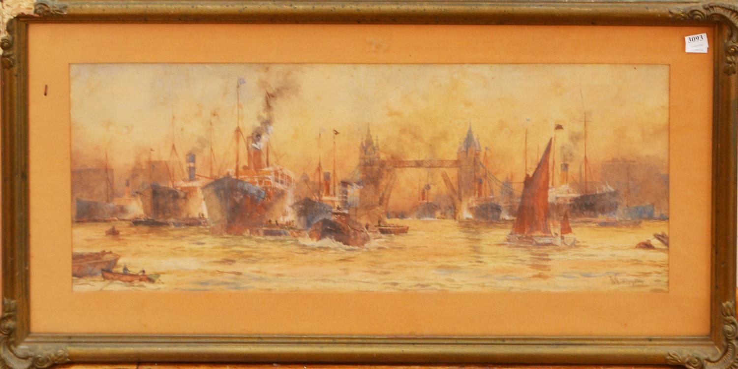 WILLIAM WHITTINGTON, THE LOWER BRIDGE, WATERCOLOUR, 27 X 70CM, FRAME SIZE: 44 X 86CM, CONDITION: MAJOR FOXING, WATER DAMAGE AND LOSSES TO PIGMENT, MAJOR LOSSES TO FRAME