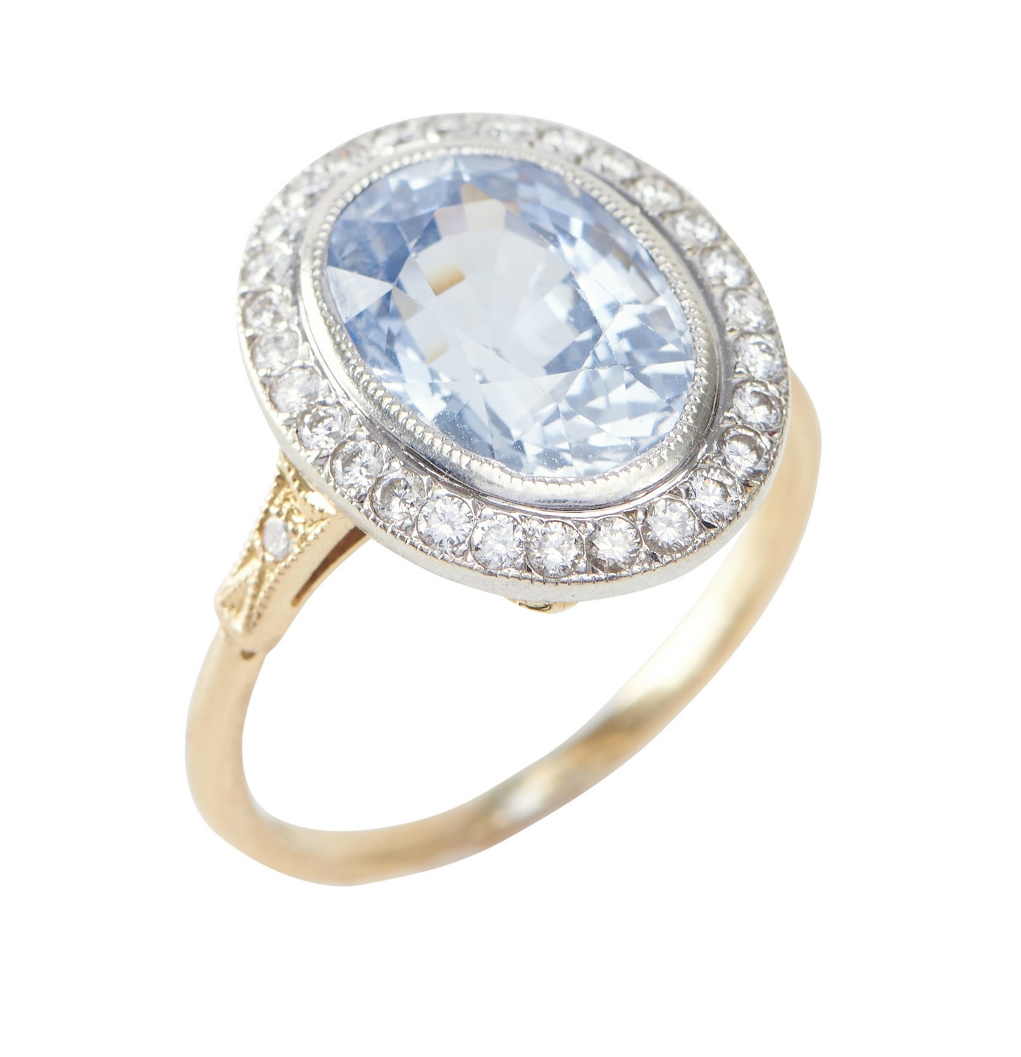 The ring presents in good condition overall. The sapphire has very minor abrasion to the facet edges. All stones are secure in their settings. Gold surfaces show minor wear.