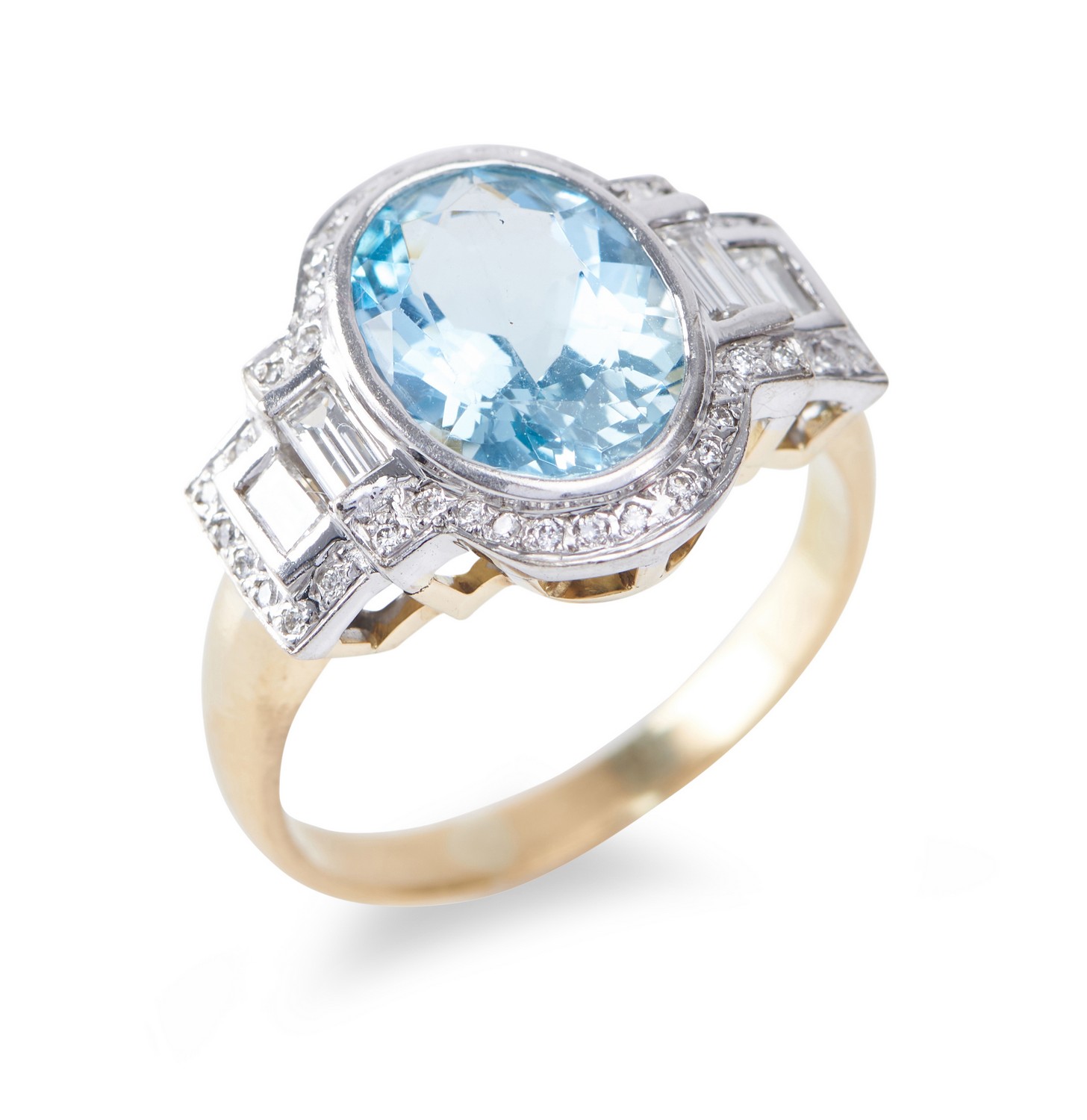 The ring presents in good condition overall with noting one baguette cut diamond has a minor chip. Minor wear to gold surfaces.