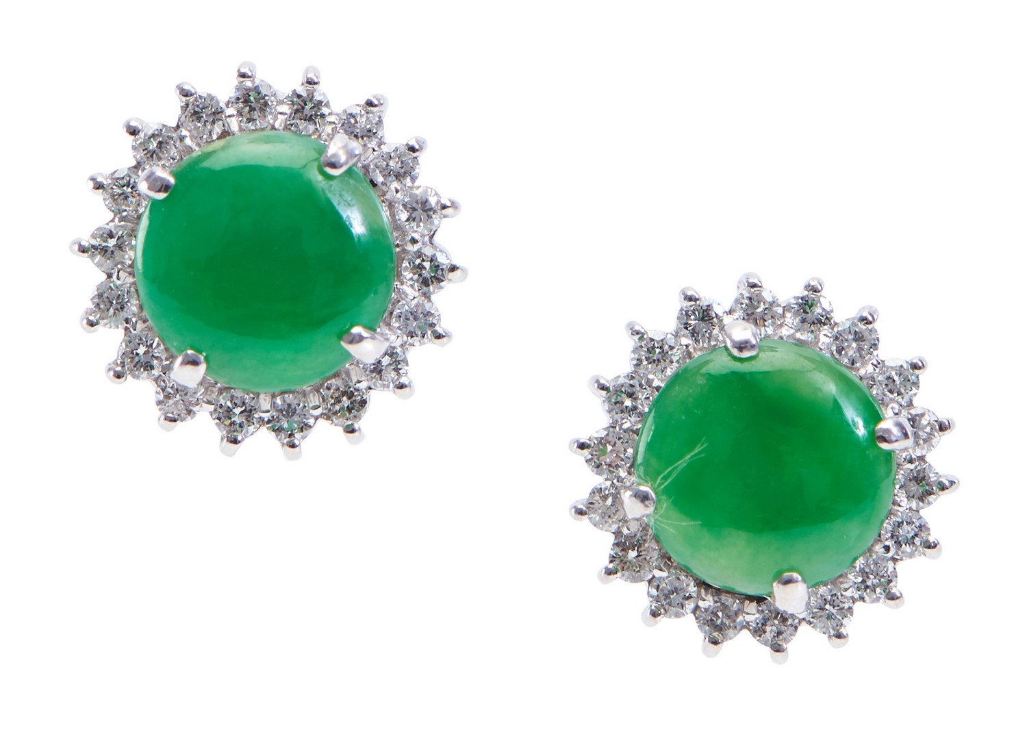 Each earring comprising a circular jade plaque cut en cabochon, within a fine border of round brilliant cut diamonds, in 18ct white gold.