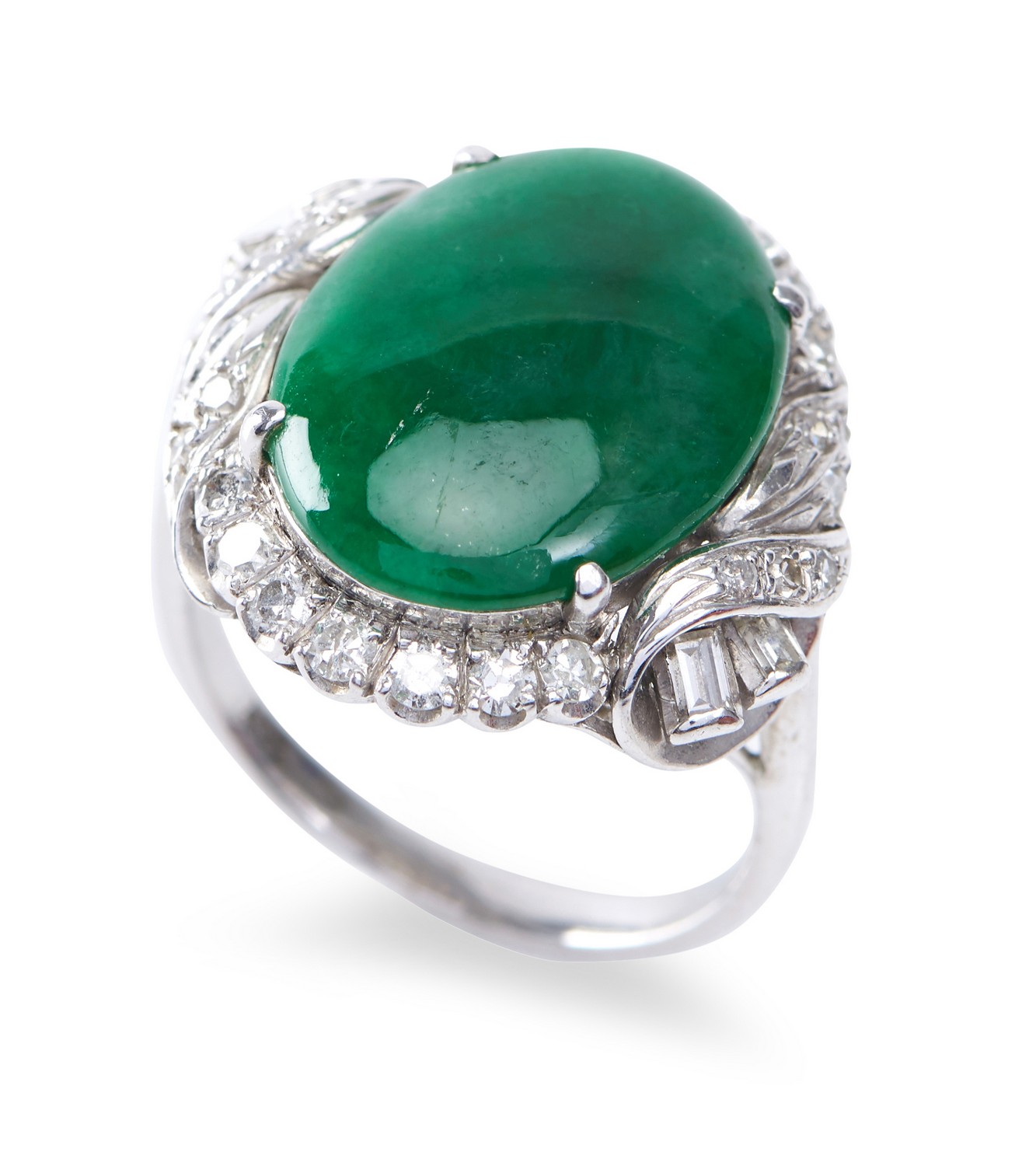 Featuring an oval jade plaque cut en cabochon, within a decorative surround of single and baguette cut diamonds, in 14ct white gold, ring size L 1/2.