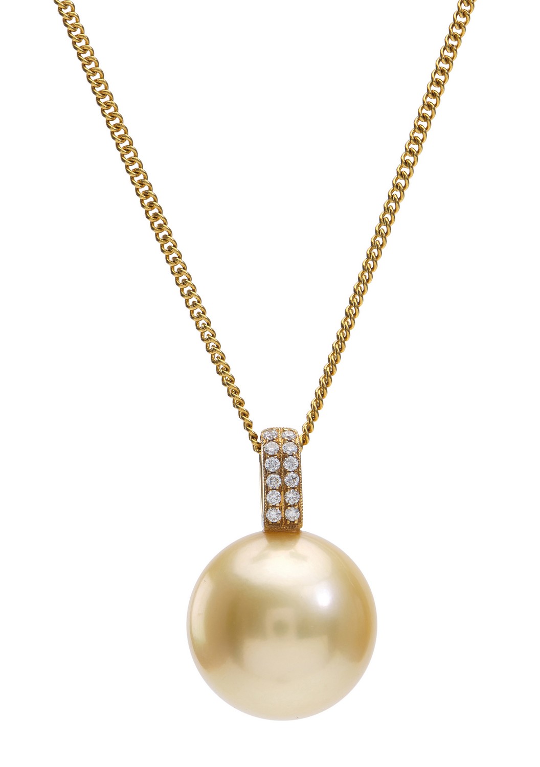 The round pearl of golden hues, measuring 15.8mm, to a bale set with twelve round brilliant cut diamonds weighing 0.10cts, in 18ct gold.