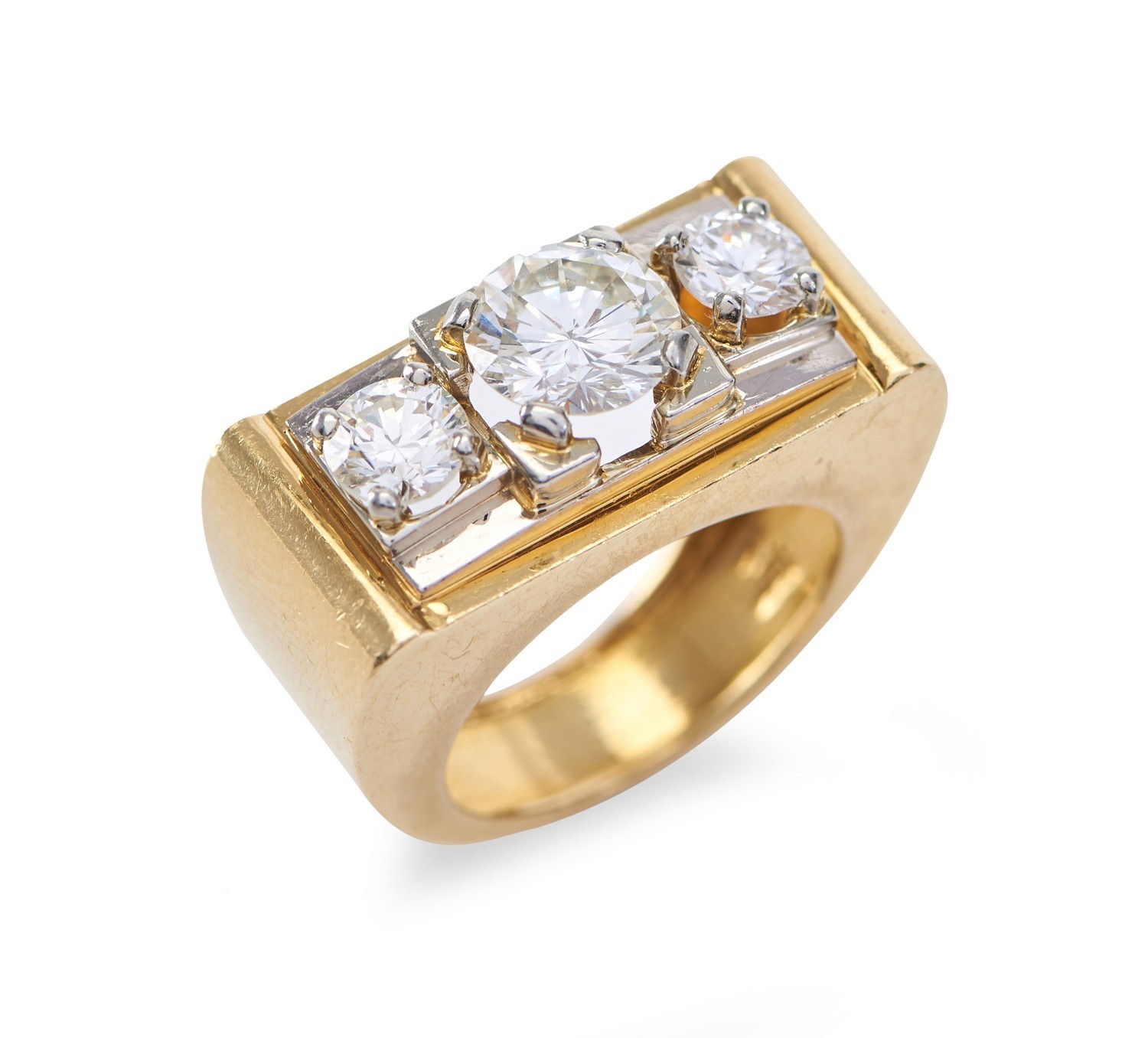 The ring presents in very good overall condition with minor evidence of wear to gold surfaces. One side stone has very minor chip to girdle.