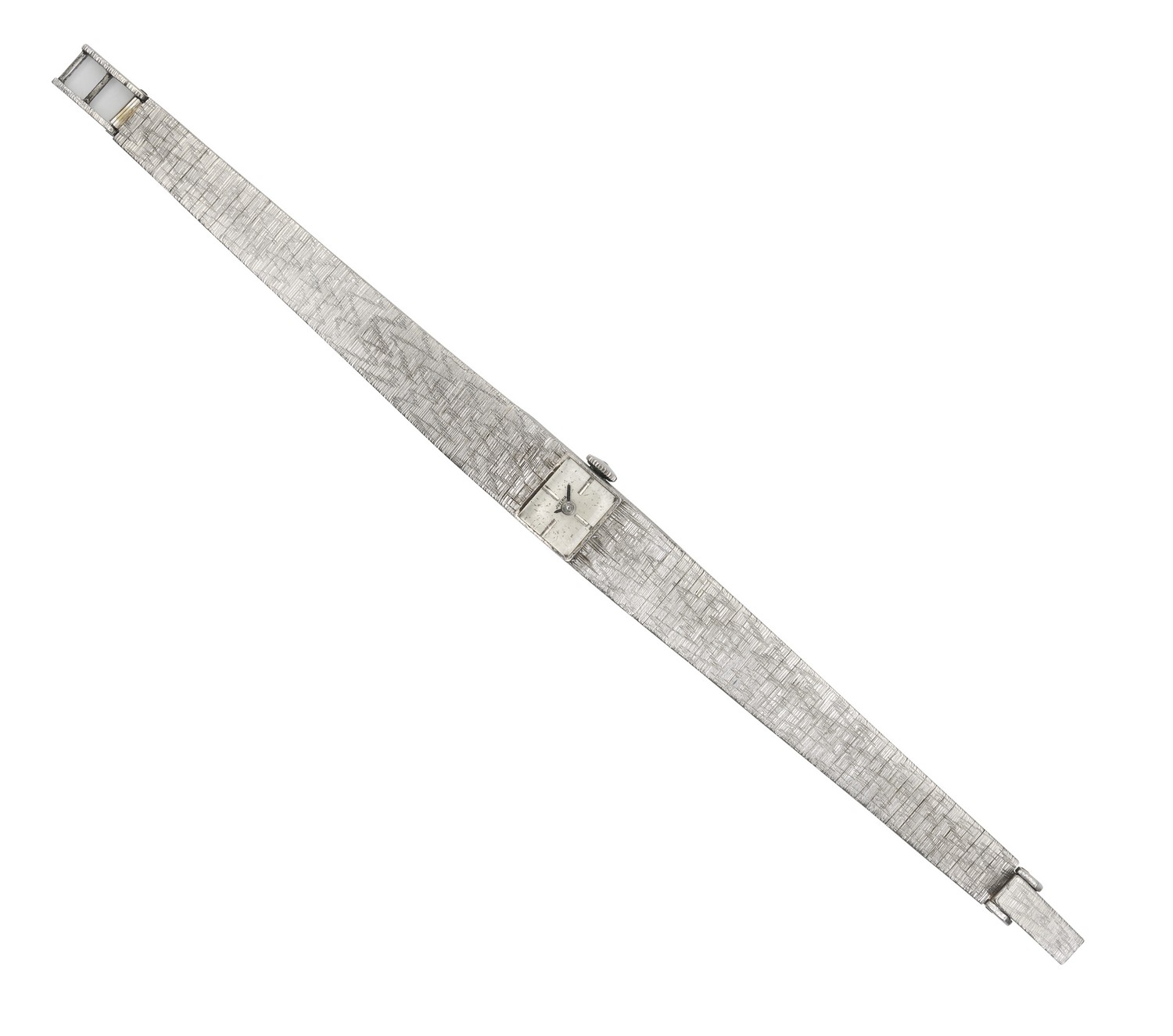 Manual wind, square silvered dial with silver baton numerals, signed case, dial and movement, 18ct gold case to integral textured bracelet bands, case length 9mm x 10mm, total length 160mm.