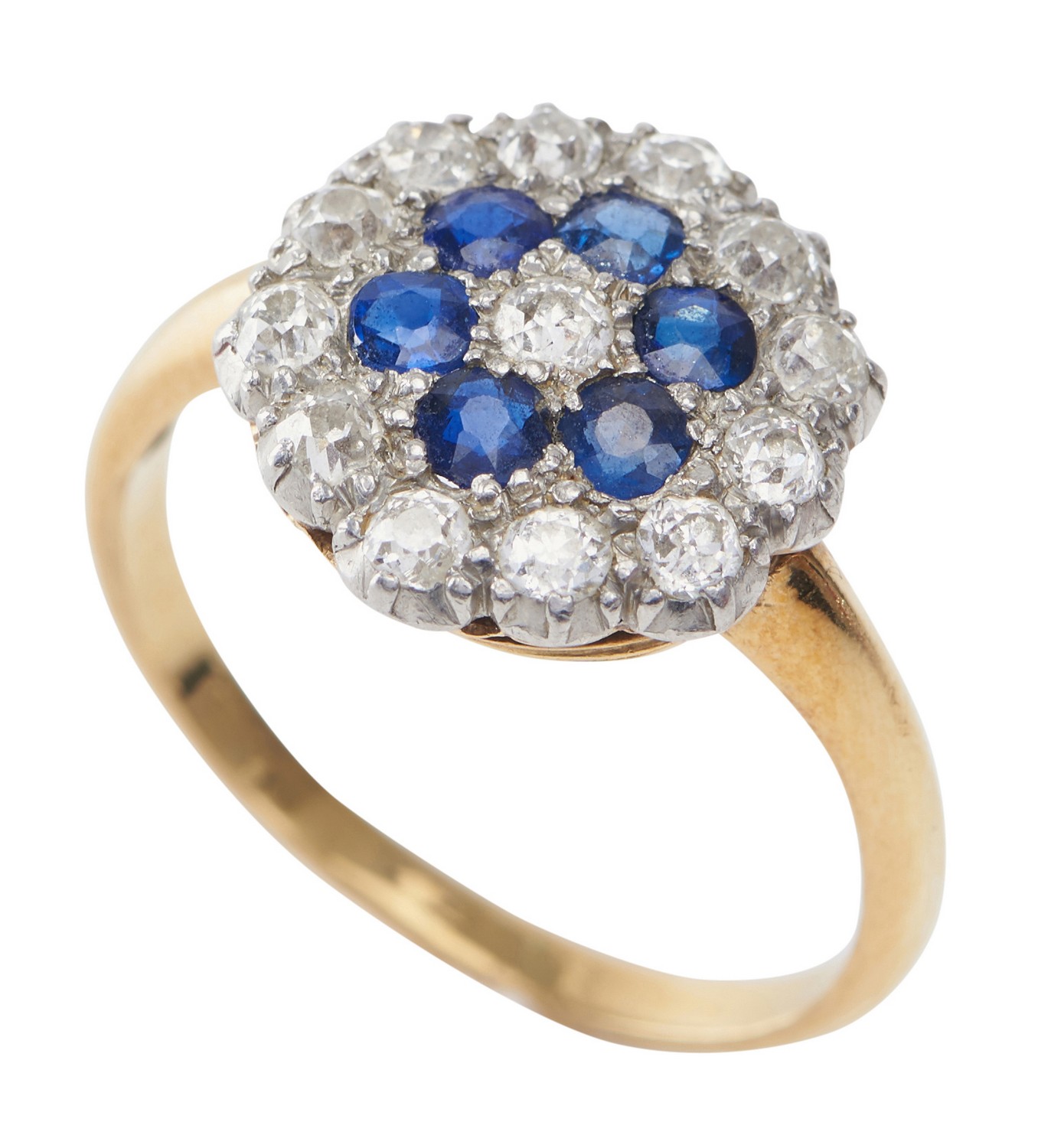 A SAPPHIRE AND DIAMOND CLUSTER RING
