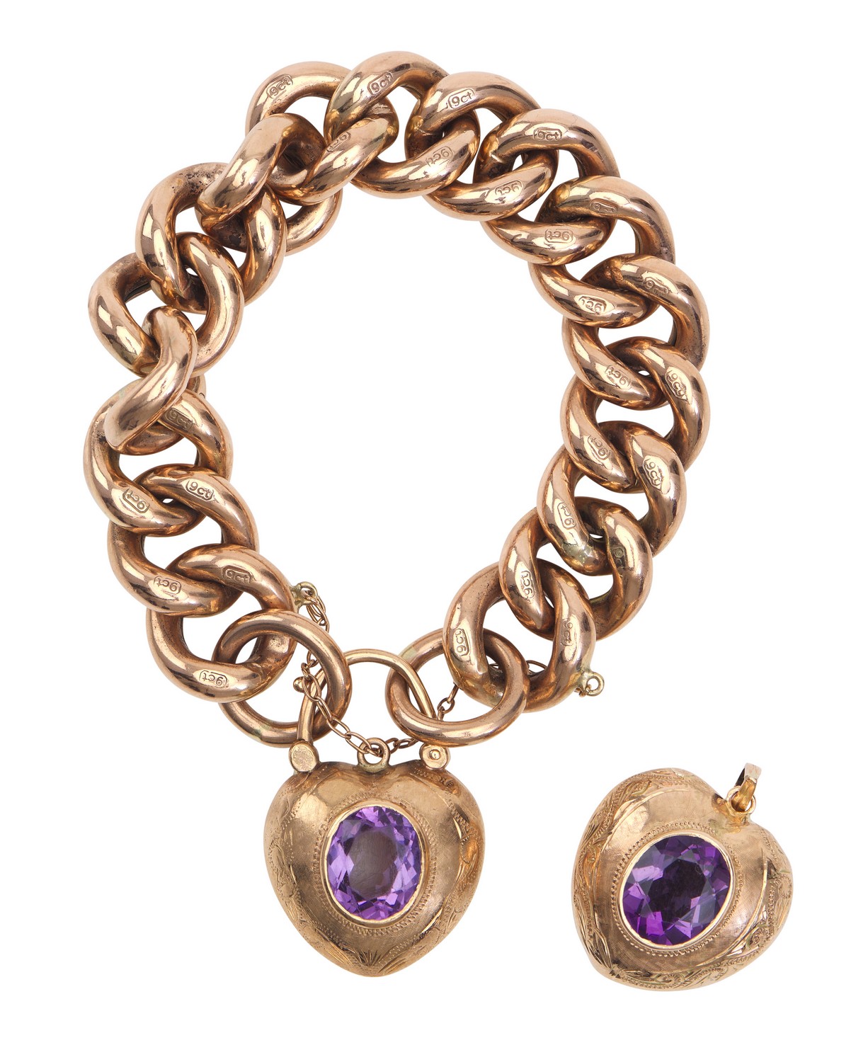 The large curb link bracelet with heart shaped padlock set with an oval amethyst, together with a conforming pendant, all in 9ct gold, total length 180mm.