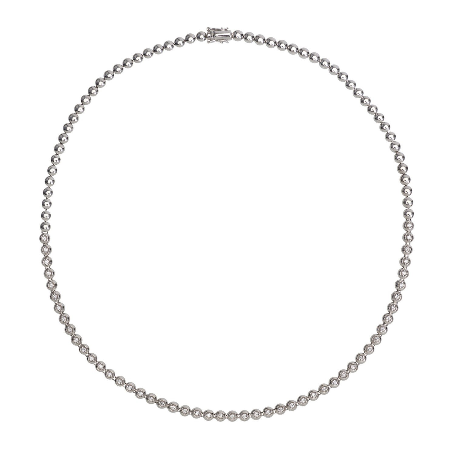 Comprising forty nine round brilliant cut diamonds totalling an estimated 0.50cts, claw set in domed links, in 18ct white gold, total length 450mm.