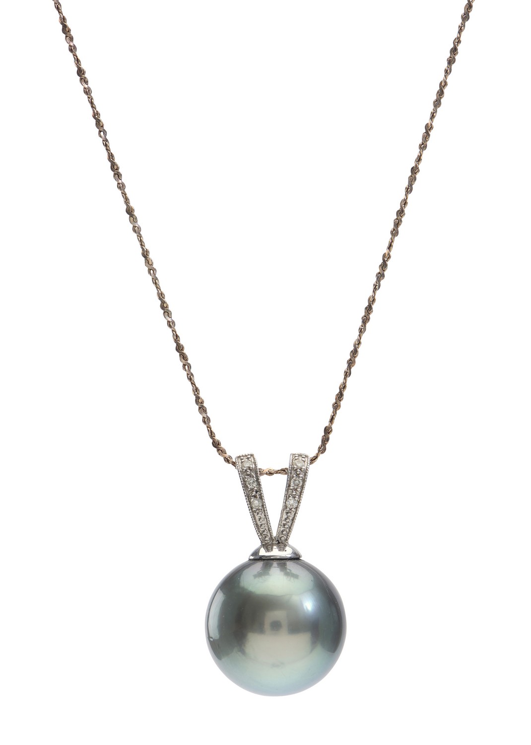 The round pearl of silver and grey hues, measuring 15.35mm, to a 'V' shaped diamond set bale, in 18ct white gold.