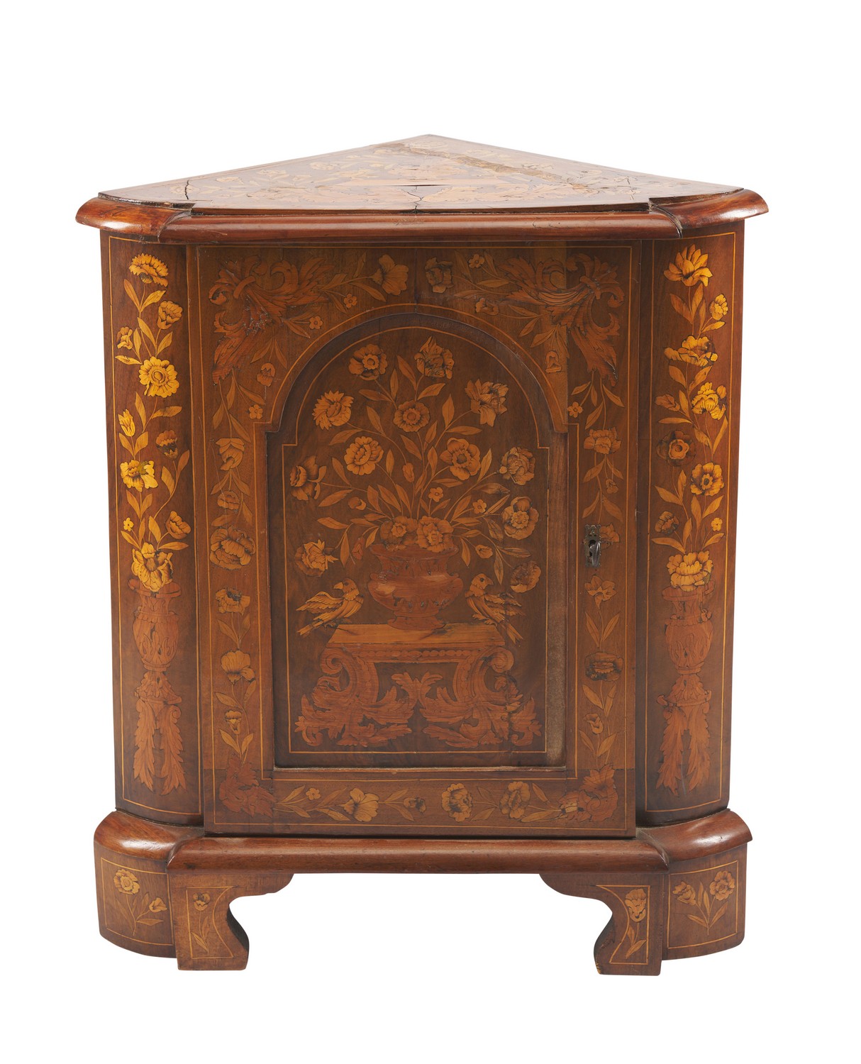 Floral marquetry and string inlay to overall, the moulded top above a single door with a fielded arched panel, raised upon moulded bracket feet