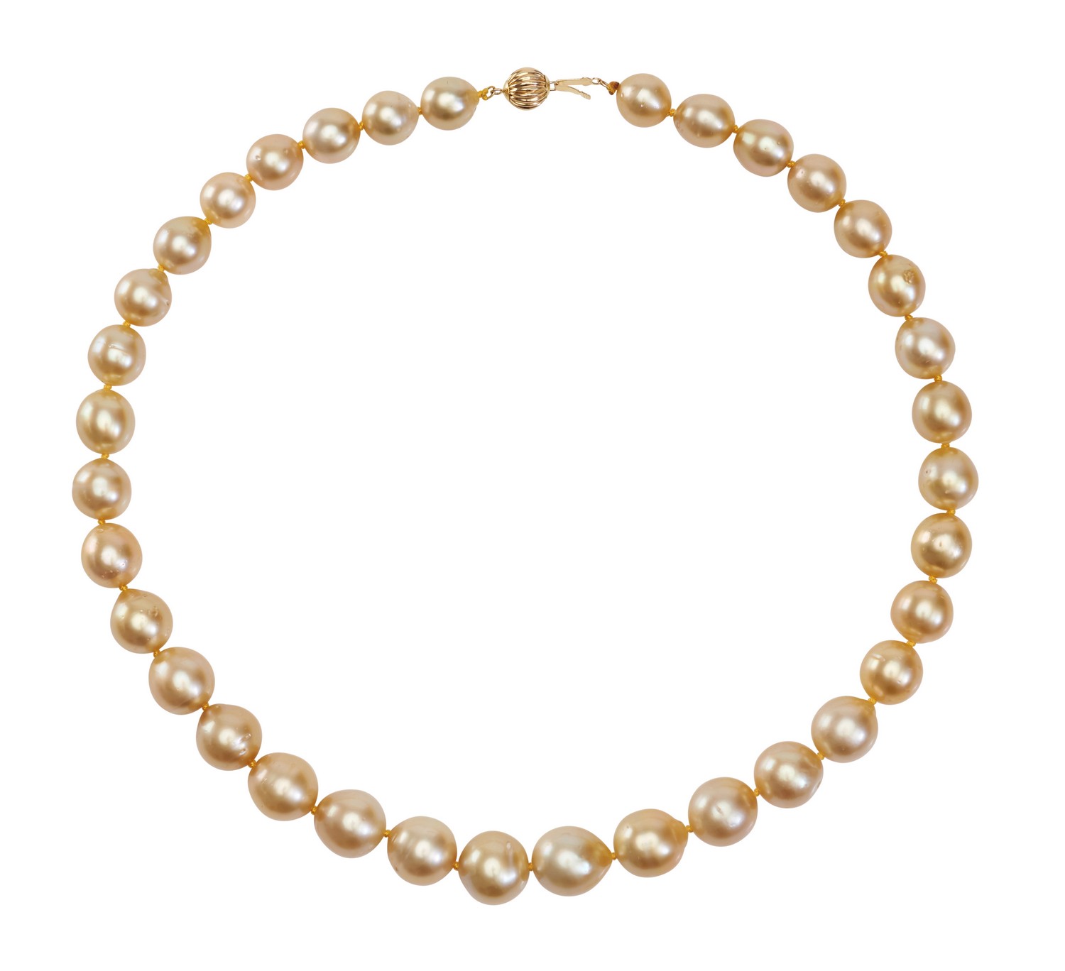 Comprising thirty five semi-baroque pearls of golden hues, to a gold ball clasp, in 18ct gold, total length 450mm.