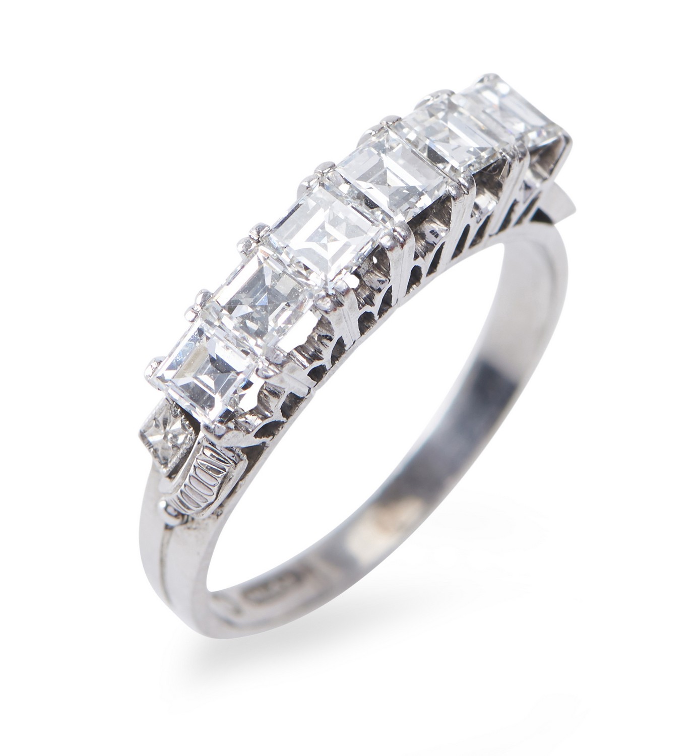 Comprising six square emerald cut diamonds totalling an estimated 1.20cts, in platinum, ring size P.