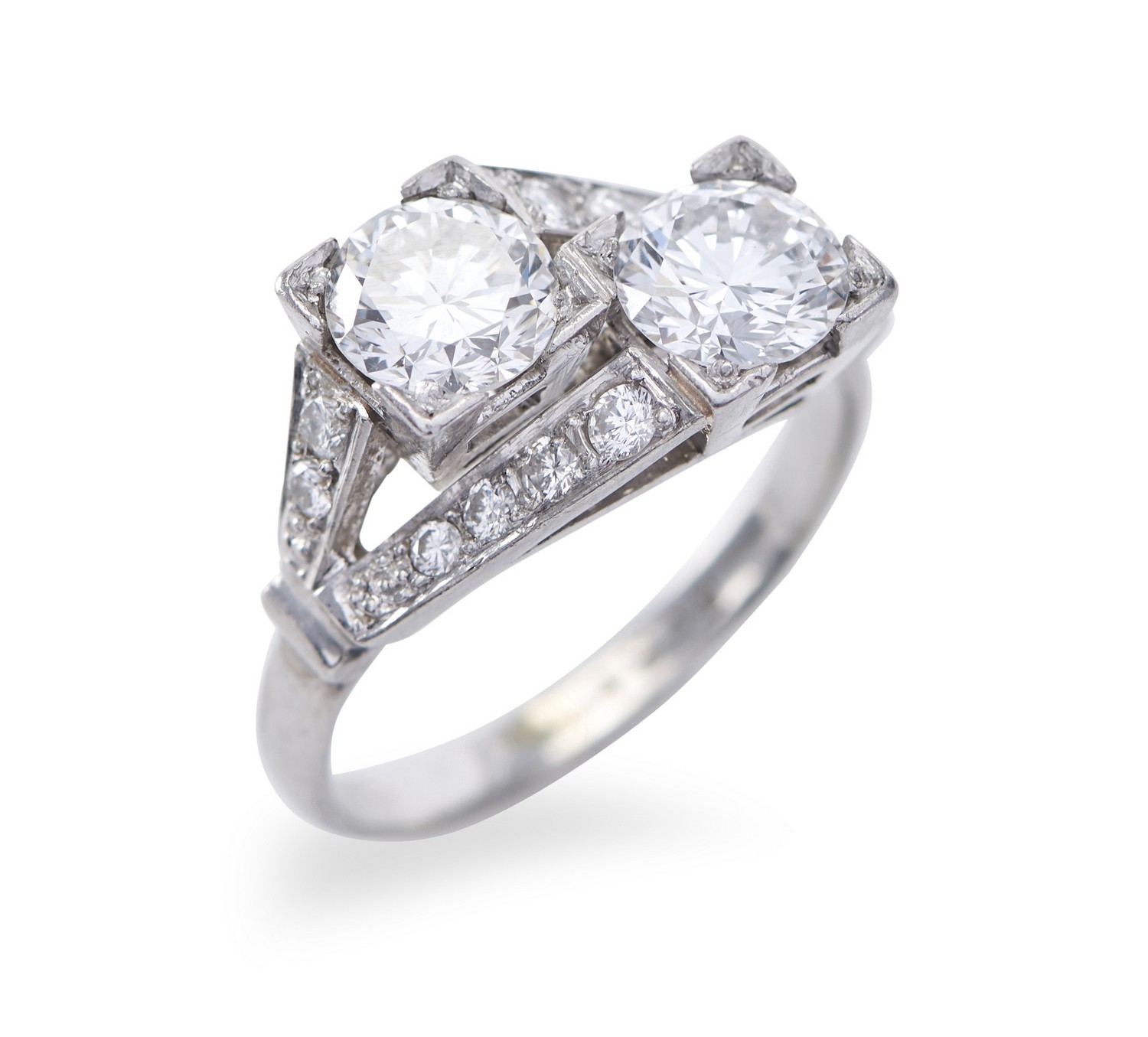 Of crossover design set with two round brilliant cut diamonds totalling 1.81cts, with diamond set shoulders totalling 0.24cts, in platinum, ring size O 1/2.