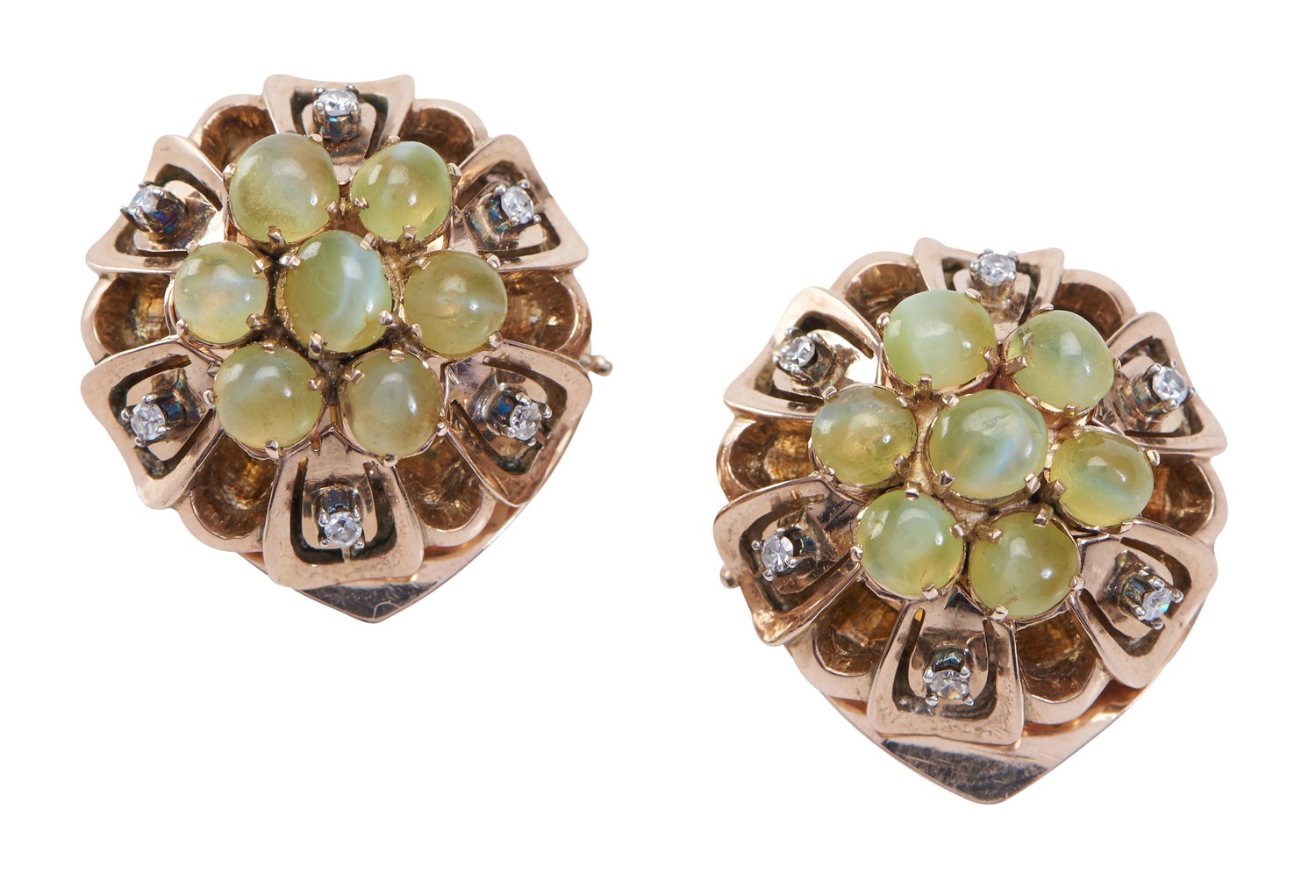 Each earring featuring a central cluster of seven cat's eye chrysoberyl cut en cabochon, within a scalloped surround detailed with round brilliant cut diamonds, to intricately engraved clip fittings, in 18ct gold.