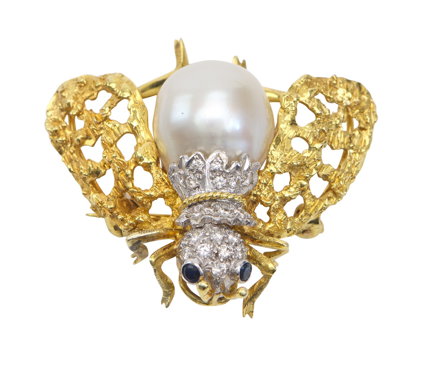 Styled as a bee, set with a South Sea pearl, pavé diamond set body and sapphire eyes, signed, in 18ct gold.