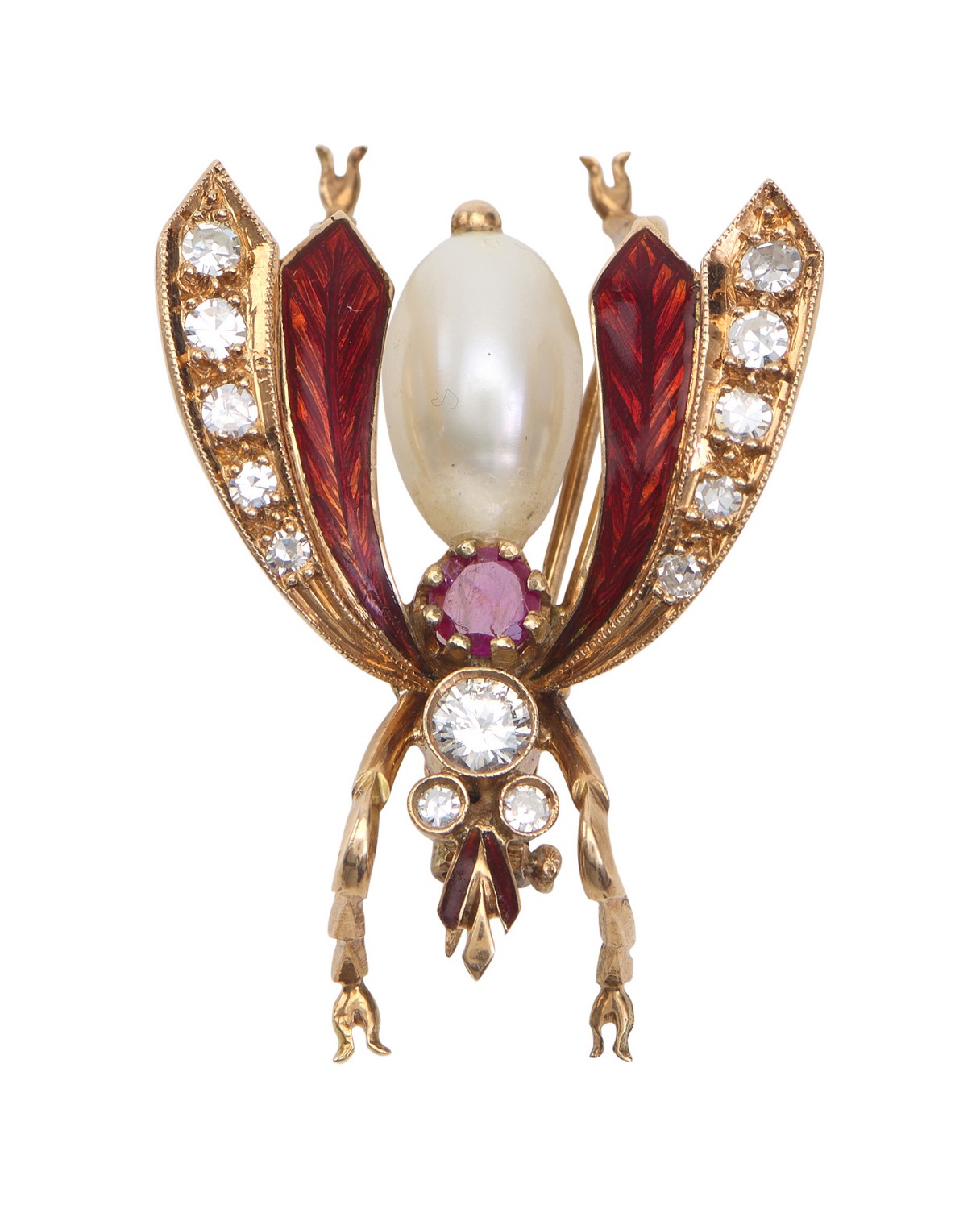 Comprising enamel and diamond set wings, the body set with a cultured pearl, a round ruby and round brilliant cut diamonds, in 14ct gold.