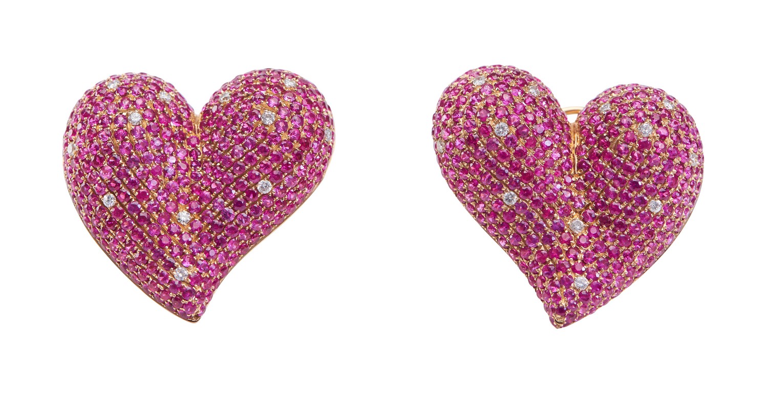 Each large domed heart pavé set with rubies totalling 4.50cts, with fine diamond detail totalling 0.16cts, to post and clip fittings, in 18ct rose gold.