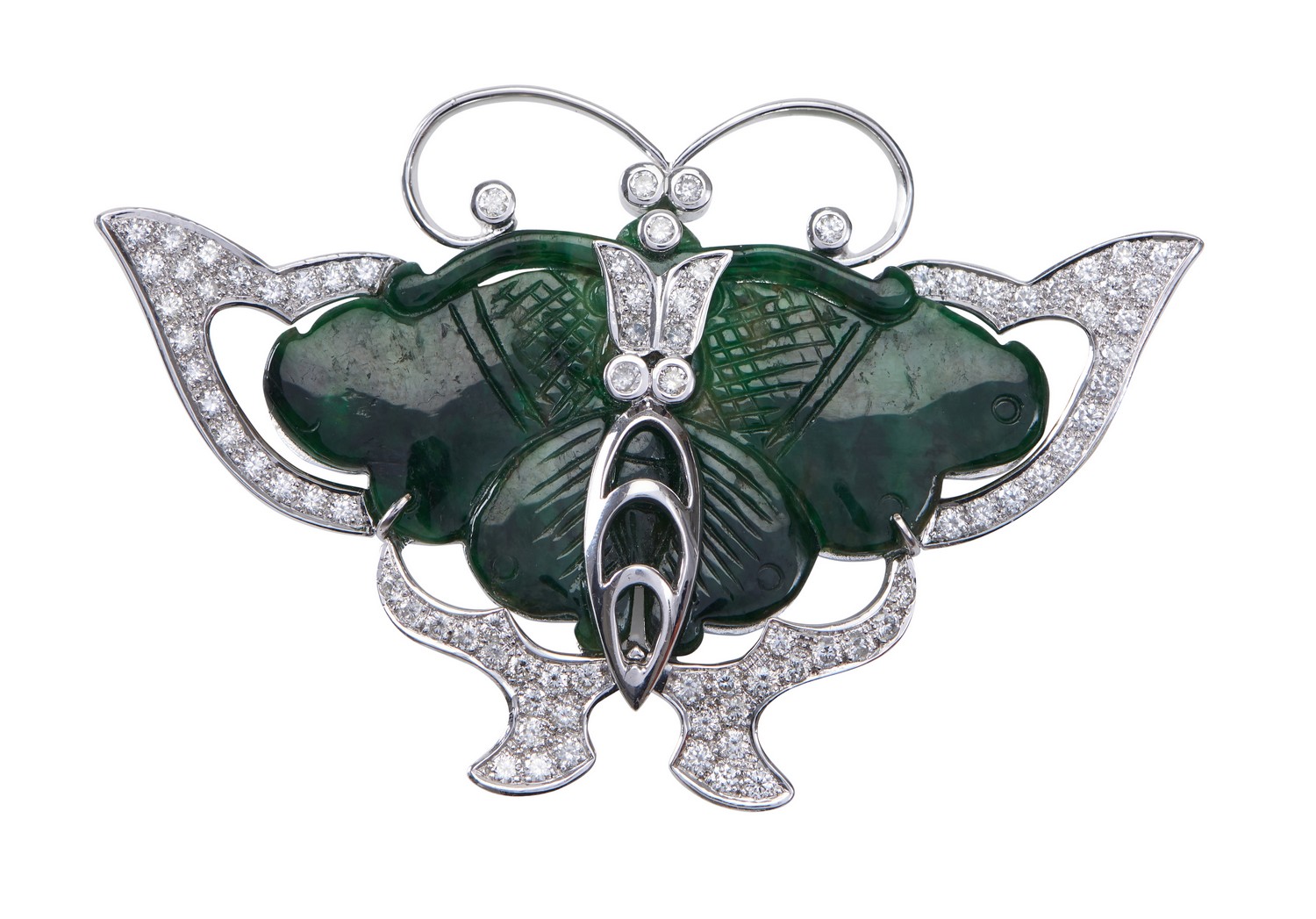 The finely detailed butterfly comprising a carved jade panel, mounted within a diamond set body and wings, totalling 1.05cts, in white gold.