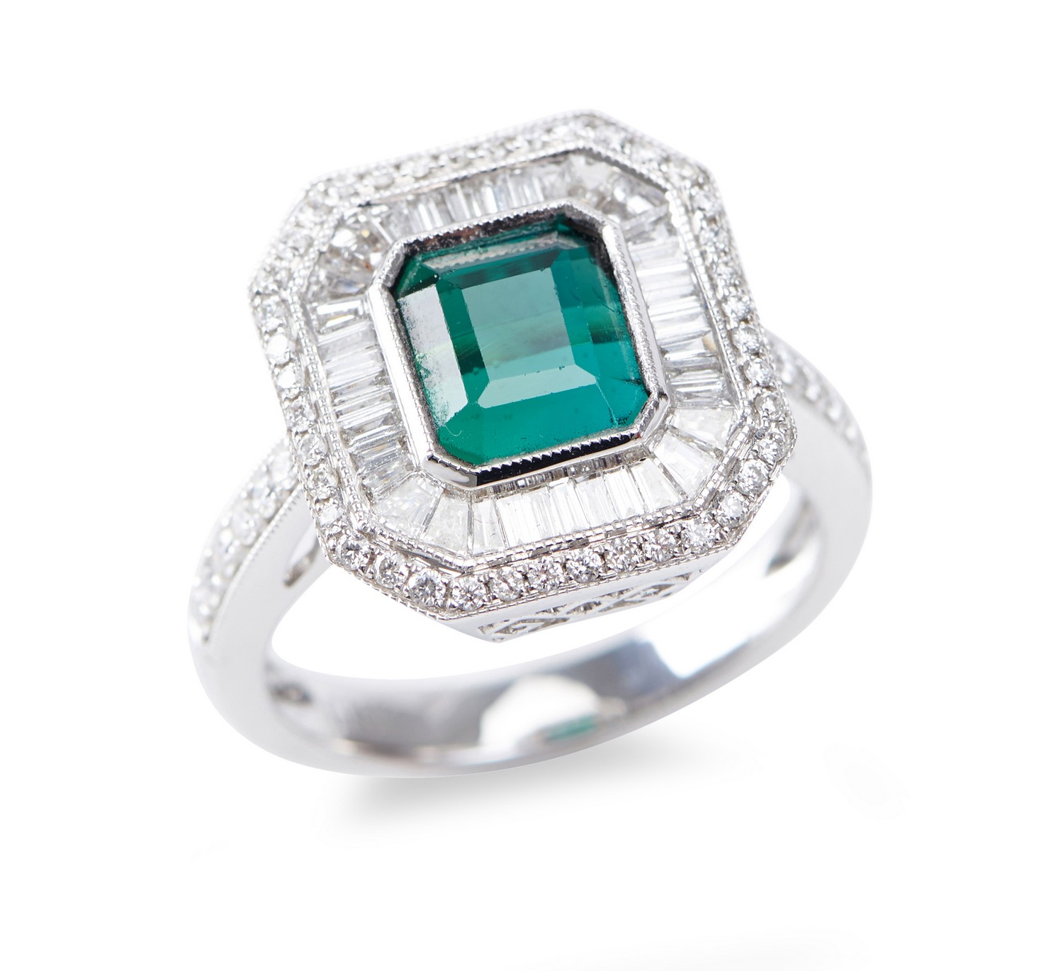 Featuring an octagonal step cut green tourmaline weighing 3.15cts, surrounded by baguette and round brilliant cut diamonds totalling 0.87cts, in 18ct white gold, ring size N.