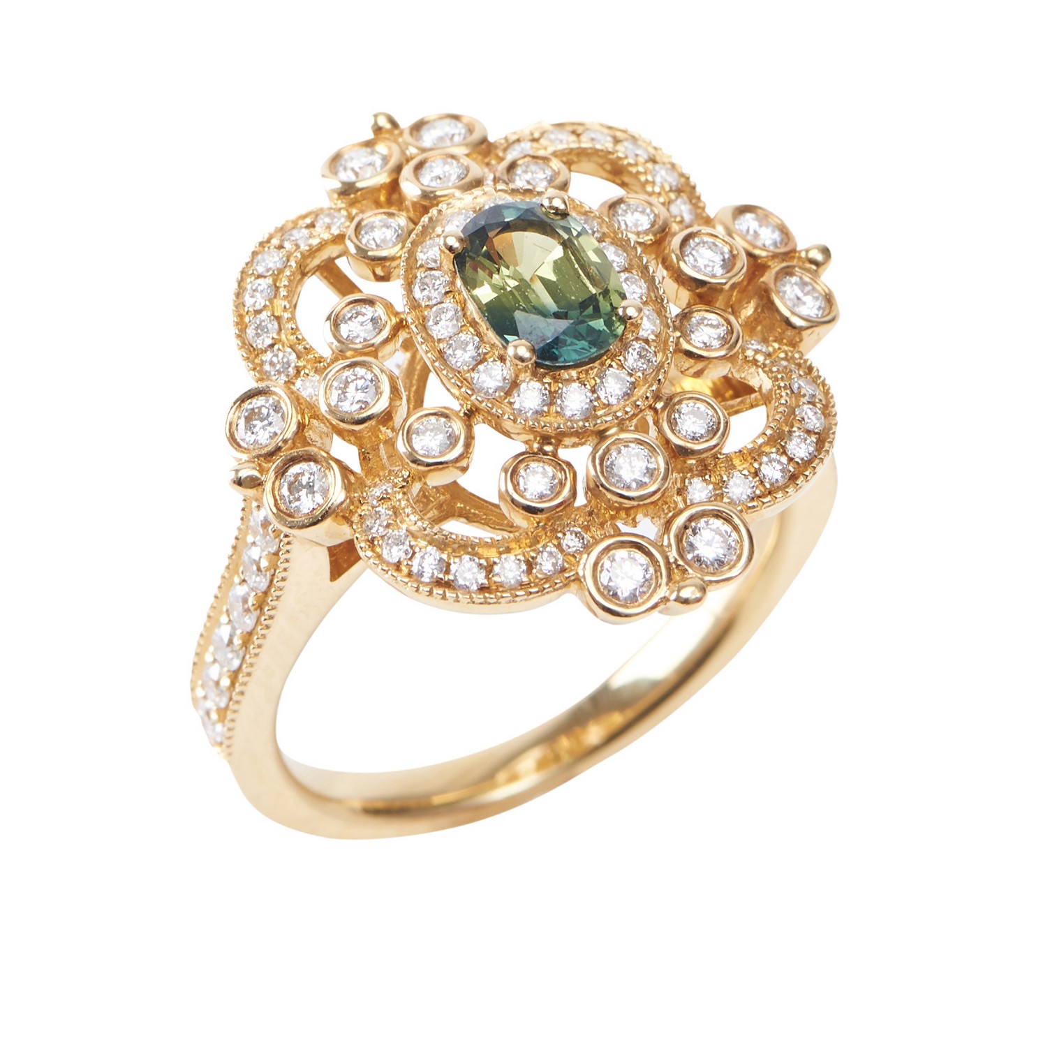 Featuring an oval parti-coloured sapphire weighing 0.65cts, within a decorative pierced surround set with round brilliant cut diamonds totalling 0.78cts, in 18ct gold, ring size M.