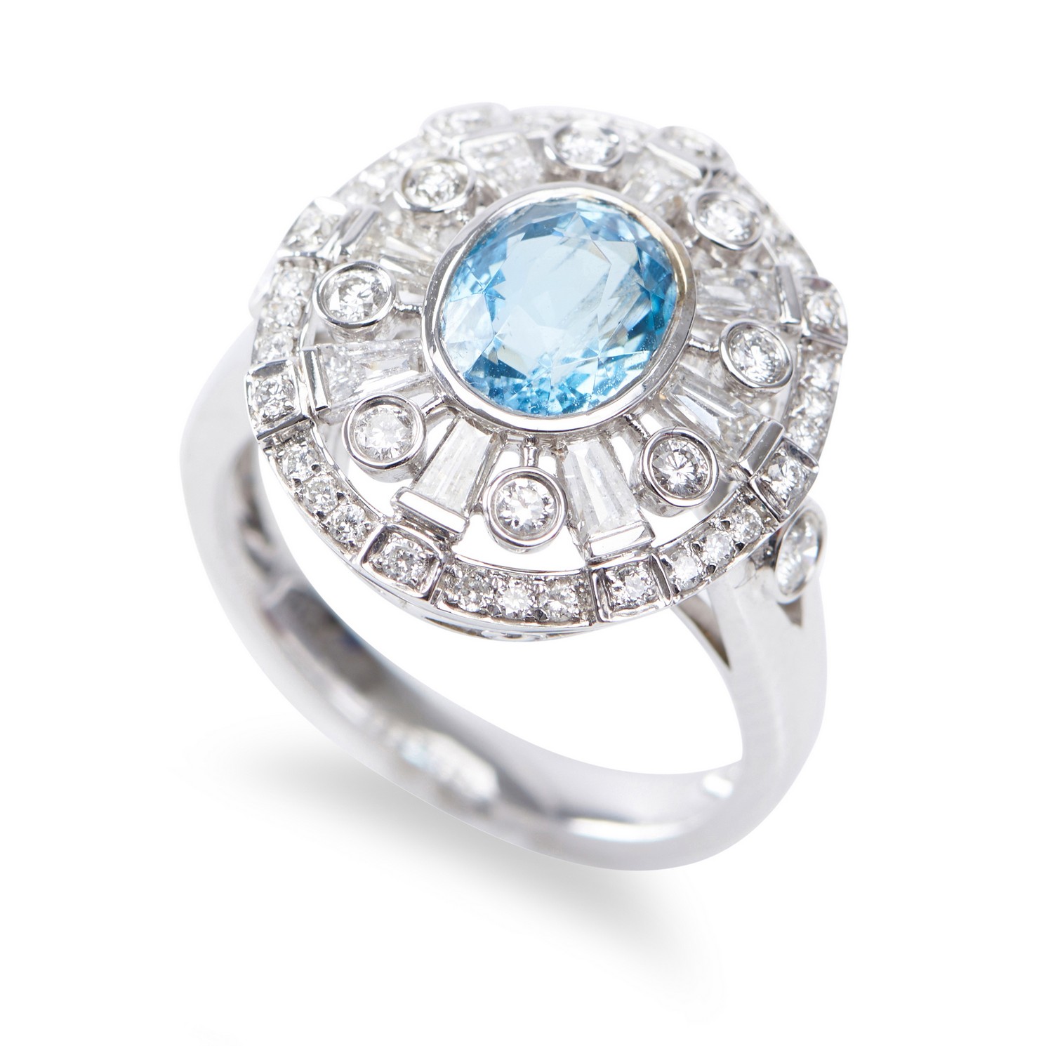 Featuring an oval aquamarine weighing 1.60cts, within a pierced surround of baguette and round brilliant cut diamonds totalling 0.80cts, in 18ct white gold, ring size O.