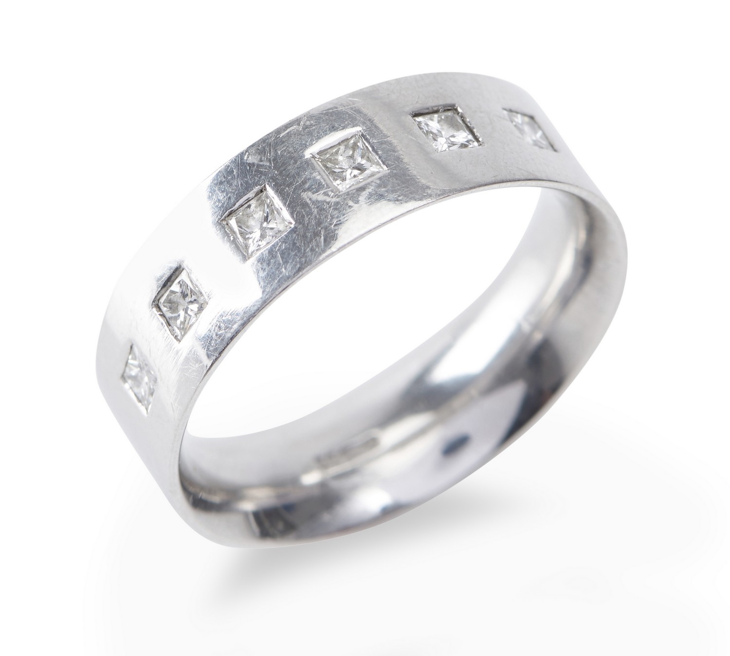 The wide band set with seven princess cut diamonds, signed H.M., in platinum, ring size V.