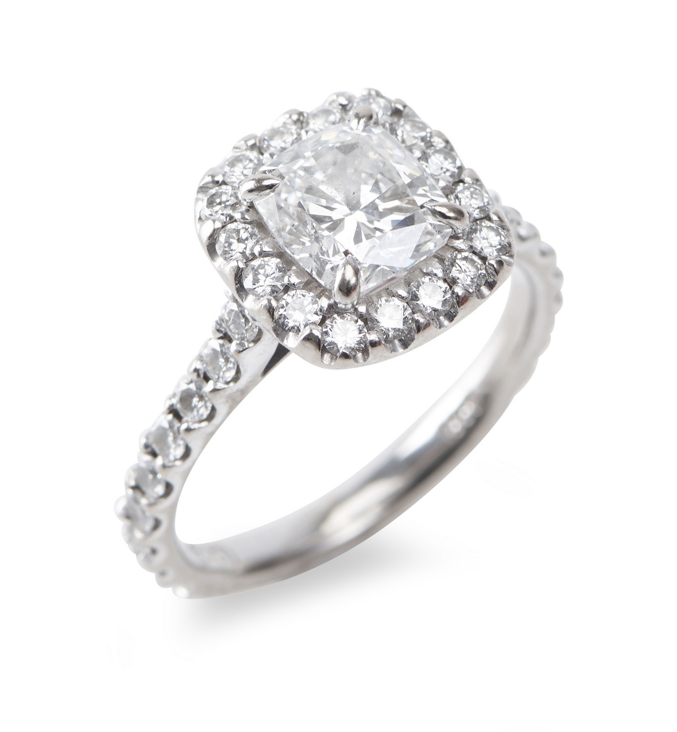 The cushion cut diamond weighing 1.50cts, bordered and shouldered by round brilliant cut diamonds totalling 0.73cts, in 18ct white gold, signed, ring size L 1/2, with accompanying GIA diamond report number 7192963560, stating colour F and clarity VS2.