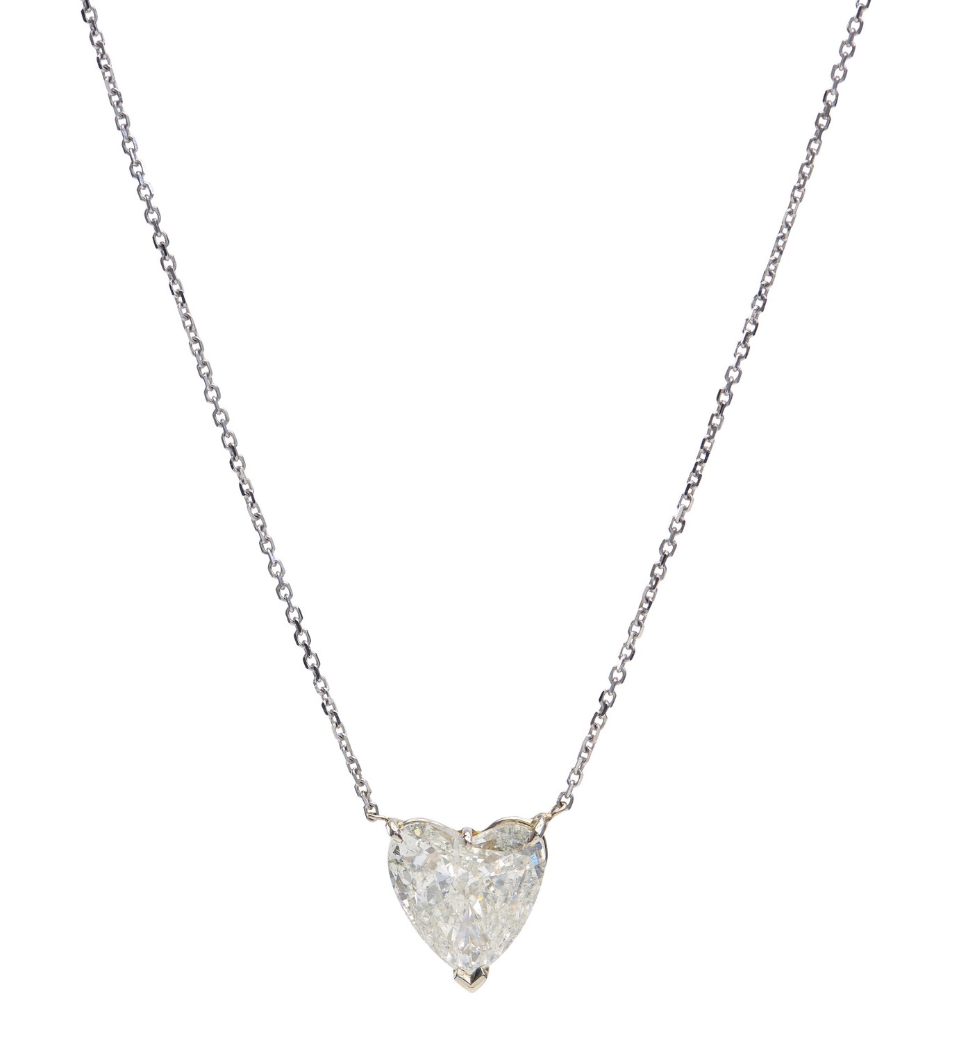 The heart cut diamond weighing 2.79cts, suspended on an integral fine trace chain, in 14ct white gold, total length 560mm.