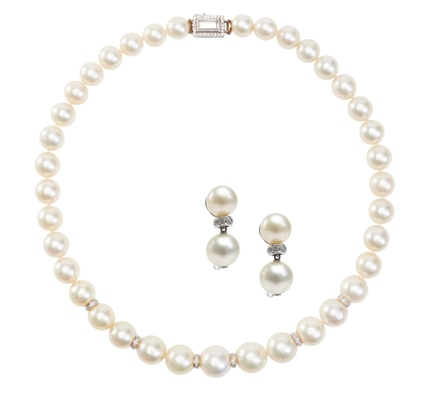 The necklace comprising thirty seven round pearls of cream hues, measuring 9.25mm to 13.0mm, spaced with six diamond set roundels, to a rectangular clasp set with an emerald cut diamond weighing 0.81cts within a border of round brilliant cut diamonds, in 18ct white gold, together with a pair of conforming earrings.