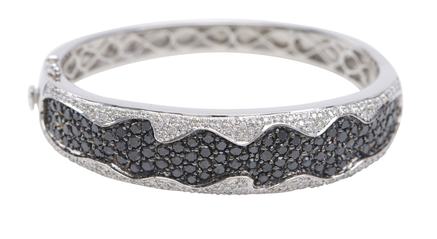 The oval hinged bangle featuring grain set round brilliant cut black diamonds in a wave formation, highlighted by pavé set white diamonds, in 18ct white gold.