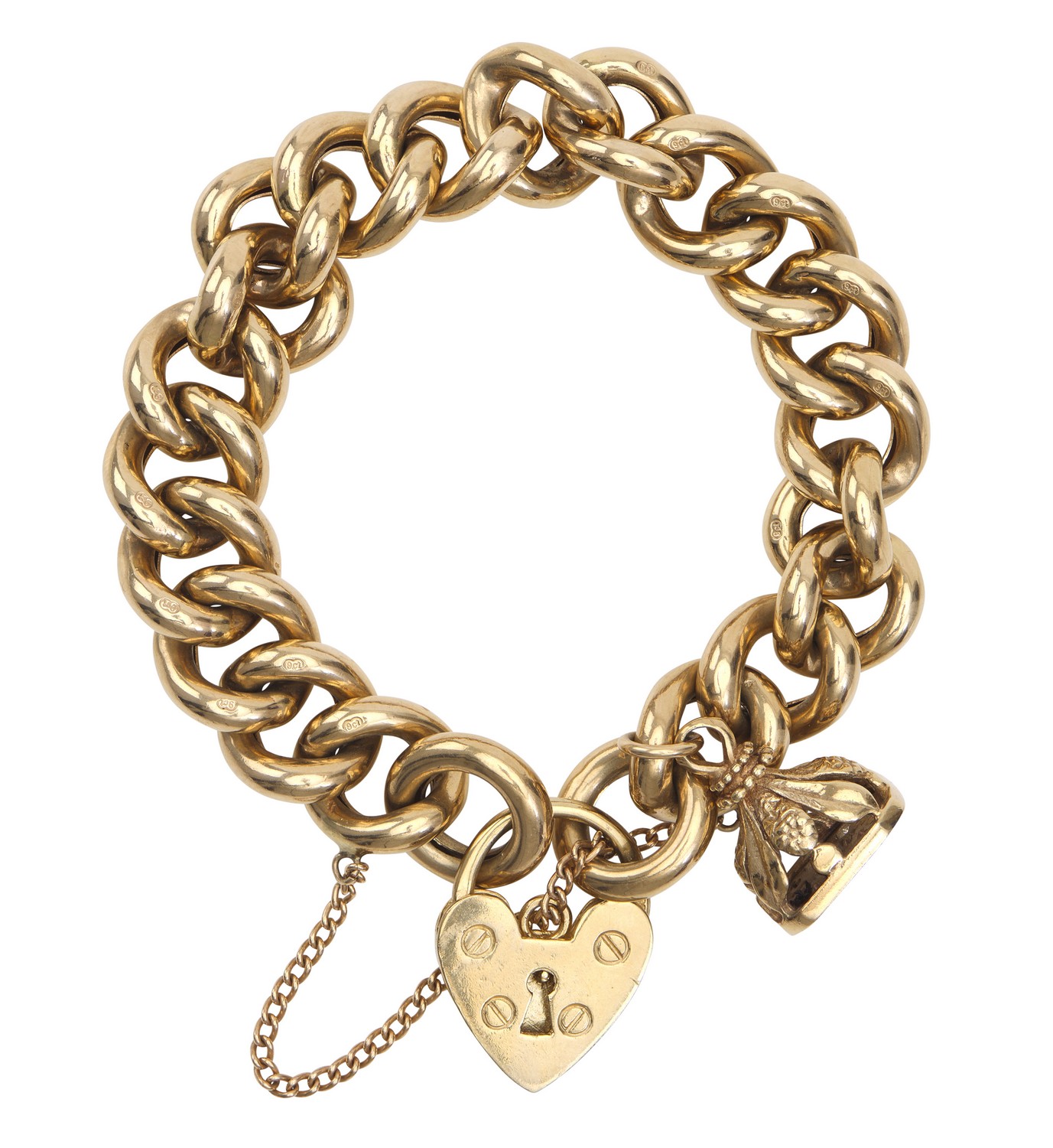 The large curb links with heart padlock clasp and seal charm, in 9ct gold, total length 190mm.