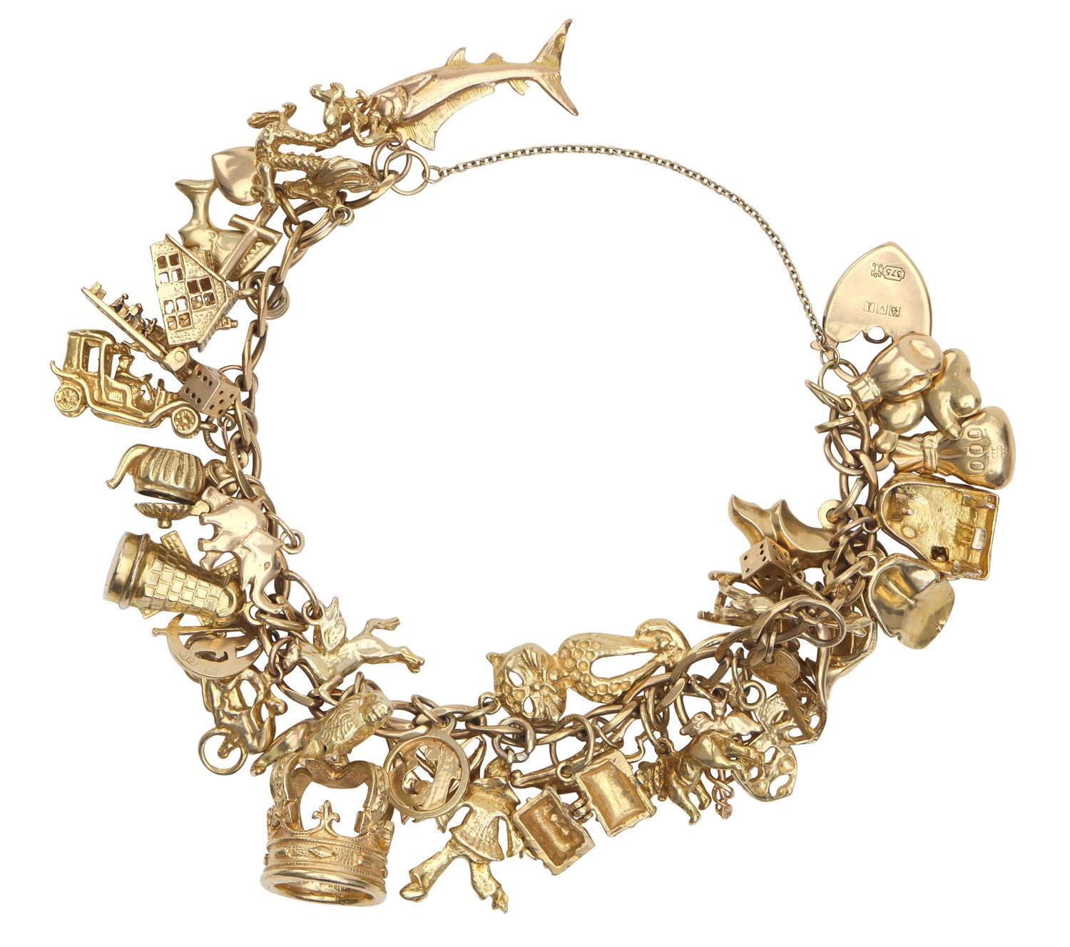 The curb link chain set with multiple charms of varying designs, in 9ct gold, total length 190mm.